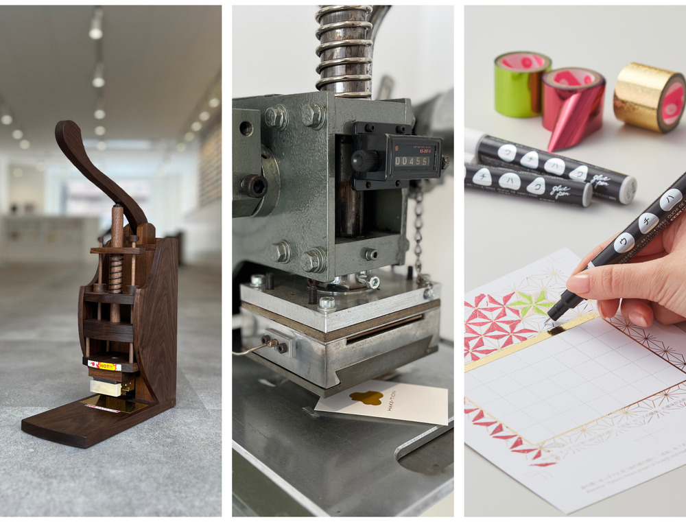 ▶手動箔押し機を使って、ズラリと並ぶ箔棚の中から好きな箔を選んで頂き、実際の箔押しを体験して頂けます