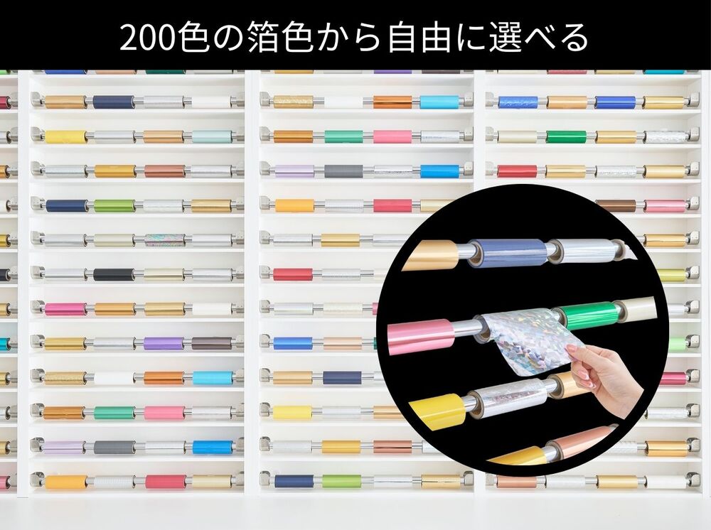 約1000巻・200色の本物の箔がずらりと並ぶ空間で、自分の“推し箔”を選び、その場で箔押し体験ができる。