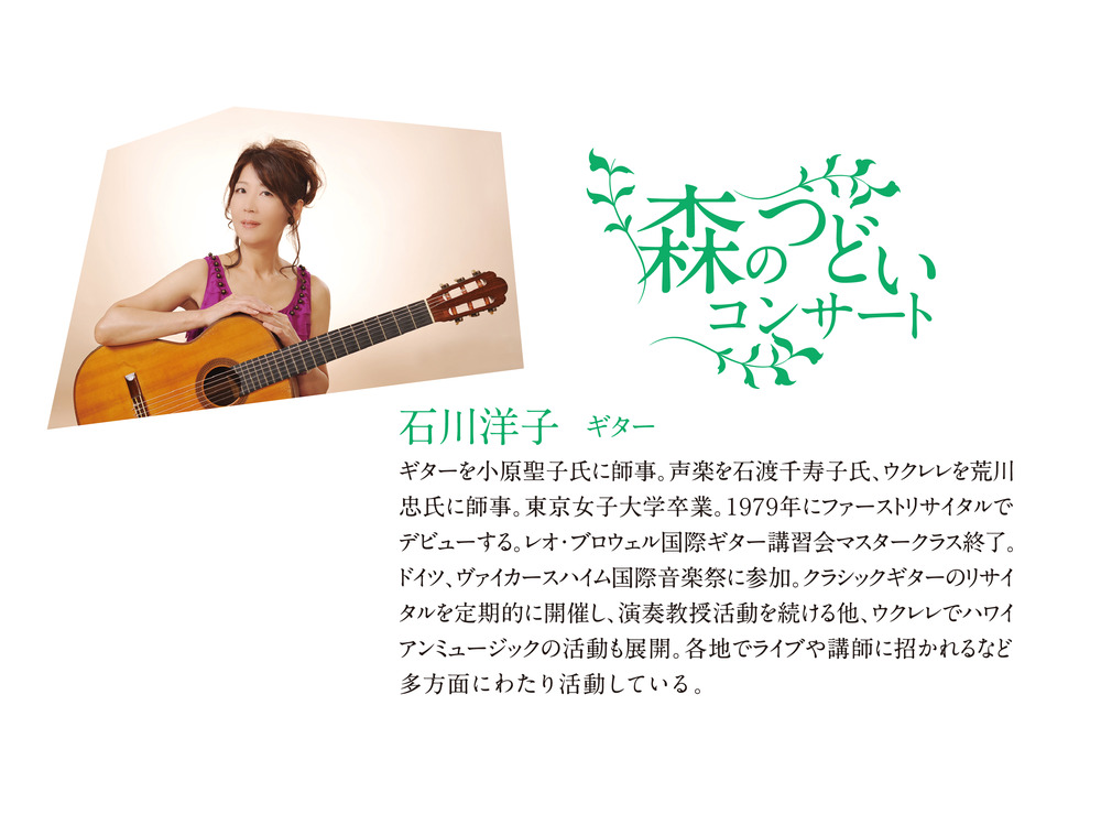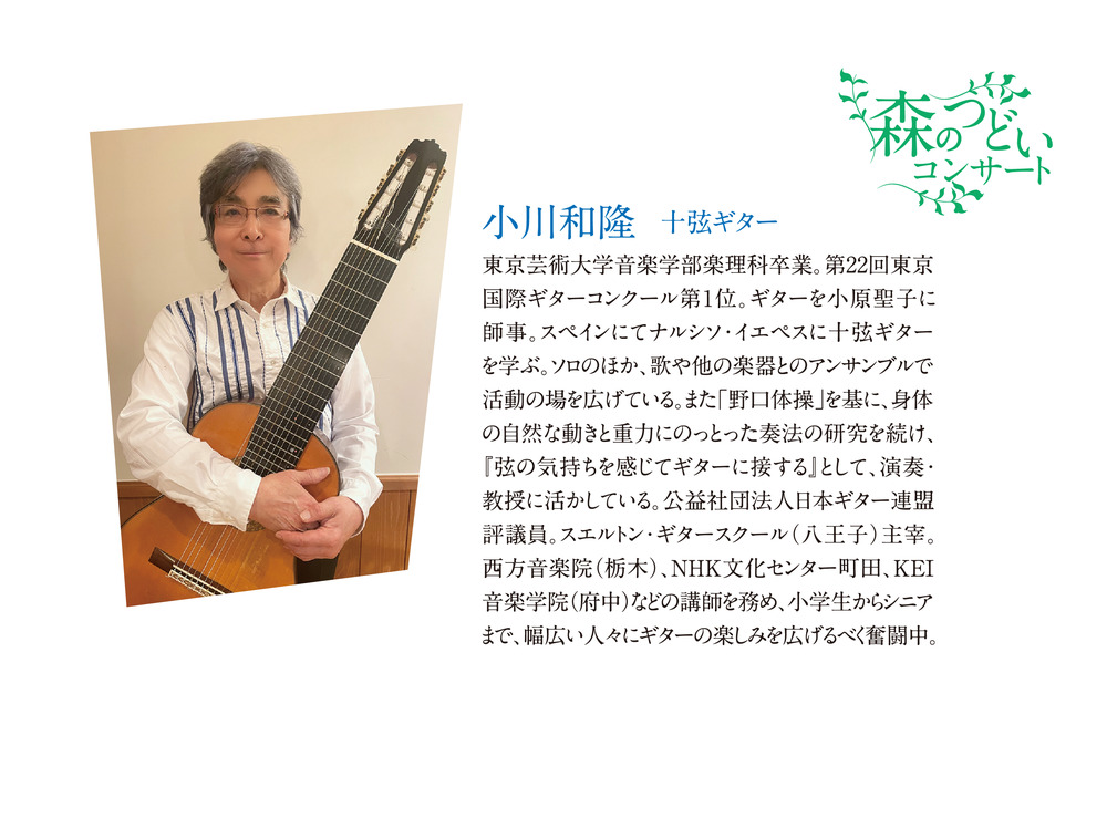 小川和隆による十弦ギターの演奏と、石川洋子によるボーカルとギター演奏、そして女優としても大活躍の南久松真奈による話術を駆使した話フォーマンスが融合した新しい形のコンサートです。クラシック好きも、ポピュラー好も楽しめる内容となっております。