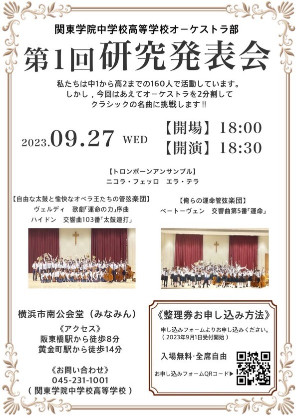 横浜市南区にある関東学院中学校高等学校のオーケストラ部です。普段は160名の部員で演奏をしておりますが、今回はオーケストラを2分割してクラシックの名曲に臨みます。ぜひお出かけ下さい。