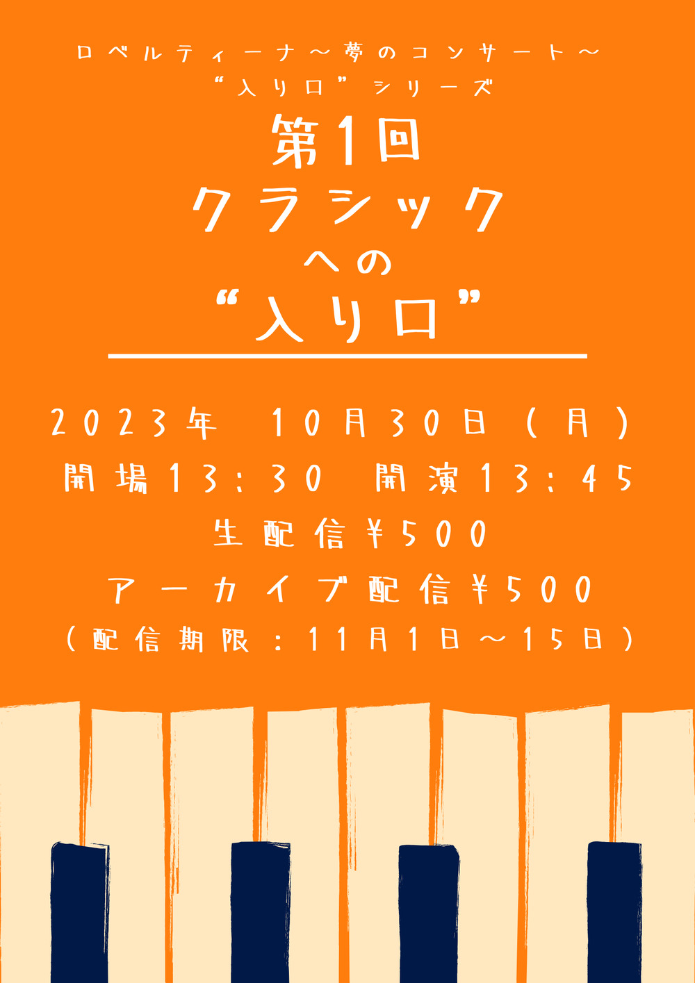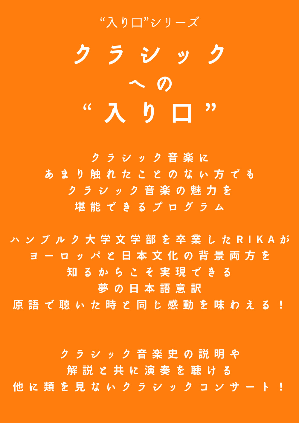 「ロベルティーナ〜夢のコンサート〜」がお送りする"入り口"シリーズ。記念すべき第一回は「クラシックへの"入り口"」をテーマにクラシック音楽にあまり触れたことのない方、クラシック音楽を聞くのは好きだけどあまり詳しくないといったクラシック初心者🔰の方まで楽しんで頂けるクラシック音楽史や社会背景などの解説付きのコンサート。