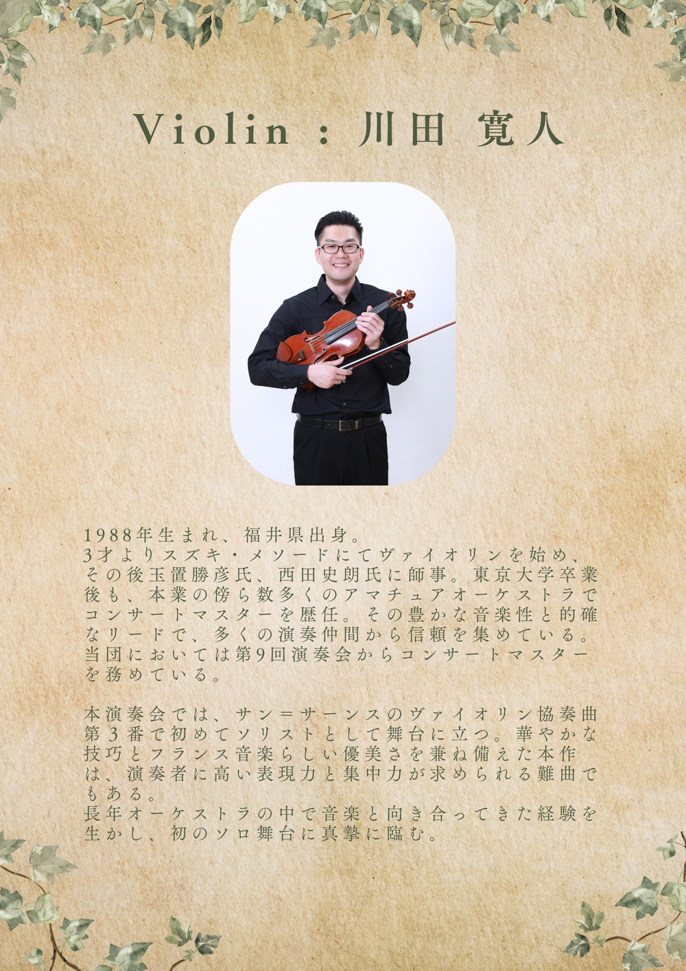 美しくも情熱的なヴァイオリン協奏曲第3番のソリストは、当団のコンサートマスターをしている川田寛人が務めます。
