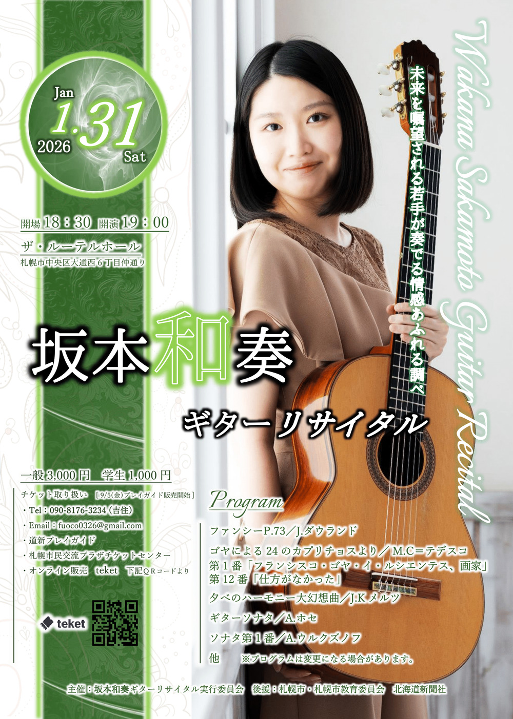 北海道出身の若手ギタリストとして最も注目を集めている坂本和奏による札幌での初リサイタル