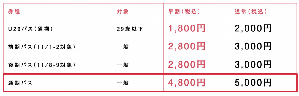・前期パス:11月1日(土)、2日(日)のみ対象