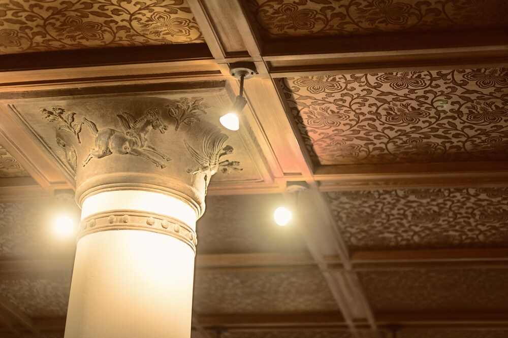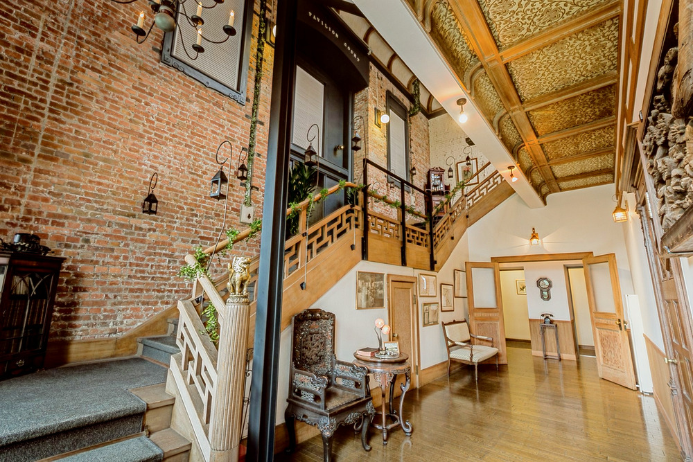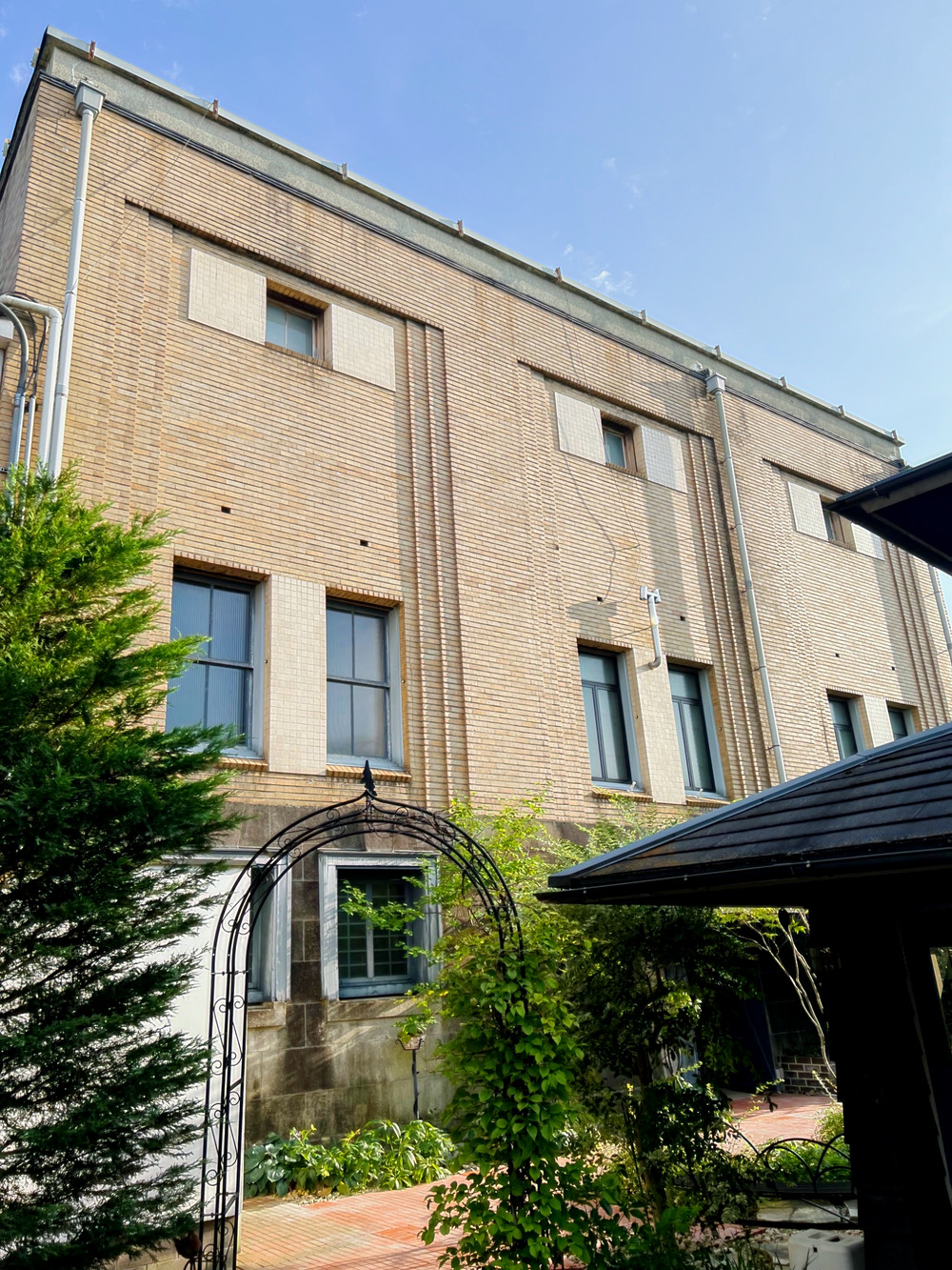 かつて国内最大級の古美術商だった旧山中商会の洋風陳列館を特別案内。パビリオンコートは、海外に東洋美術を輸出していた山中商会の京都支店が独立後、大正9(1920)年に古美術品の陳列館として建てたもの。折上格天井にトップライトを配した洋風陳列館は、京都最初期のレンガ壁鉄筋コンクリート造建築。海外からの顧客も出迎えた貴重な近代建築を、当主とじっくり拝見します。
