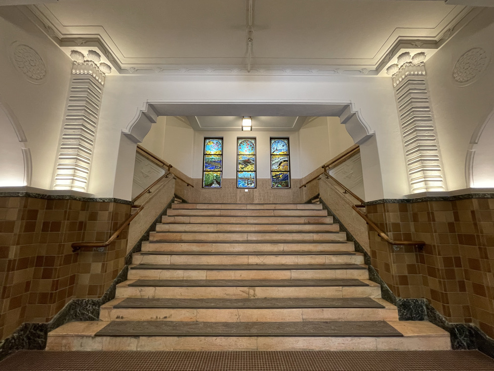 “関西建築界の父”武田五一が手がけた京都市役所本庁舎を、正庁の間から議場、地階免振スリットまで特別見学。さまざまな様式を巧みに融合させた、昭和初期ならではの豊かなデザインをもつ名庁舎です。玄関ホール、ステンドグラス、華やかな市会議場、戦時中の高射砲台座跡が残る屋上まで。リノベーションを手がけた元担当者の吉田さんとともに、じっくり堪能しましょう。