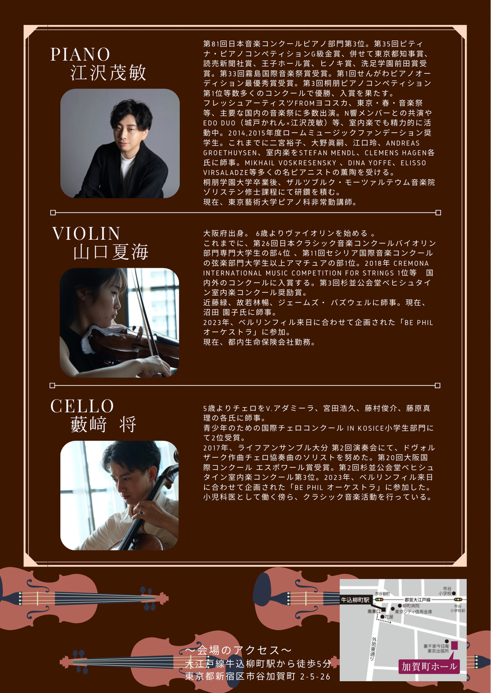 2年間のボストンの大学留学中は、Boston Philharmonic Youth Orchestraの第2バイオリントップ奏者として活動。オーケストラの団員として、ヨーロッパやスペイン各地の公演で演奏。二日間に渡るカーネギーホールの演奏会にも参加。帰国後は緩和ケア病棟での音楽療法のボランティア活動や、オーケストラ、室内楽、ソロなど広く活動。去年リサイタルを開催。現在、都内生命保険会社勤務。