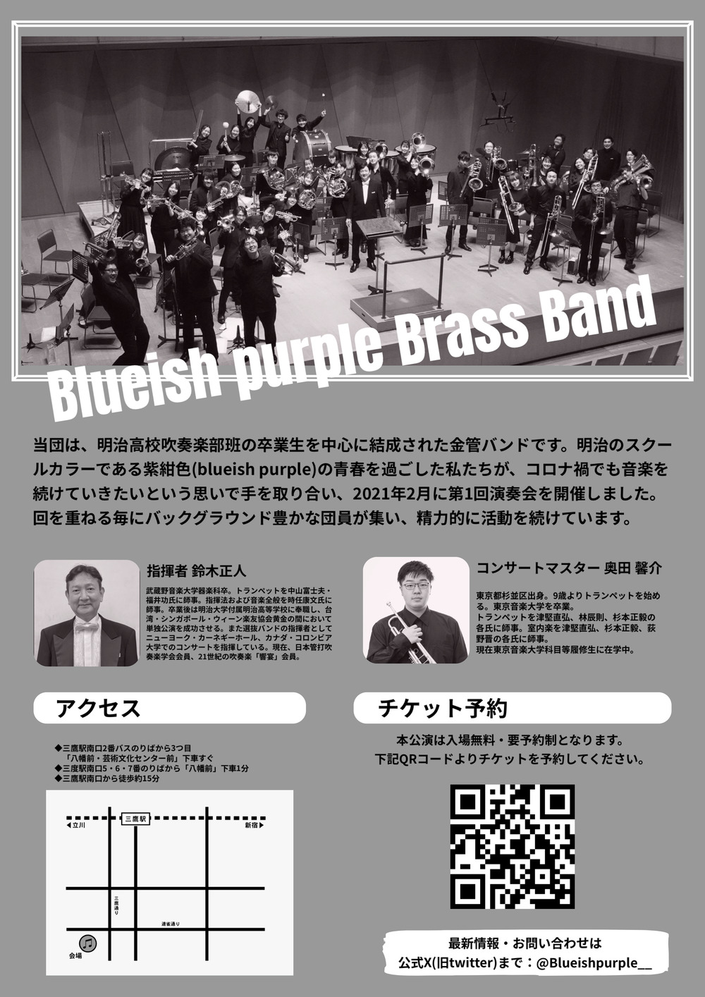 当団は、明治高校吹奏楽班の卒業生を中心に結成された金管バンドです。明治のスクールカラーである紫紺色(bluish purple)の青春を過ごした私たちが、コロナ…