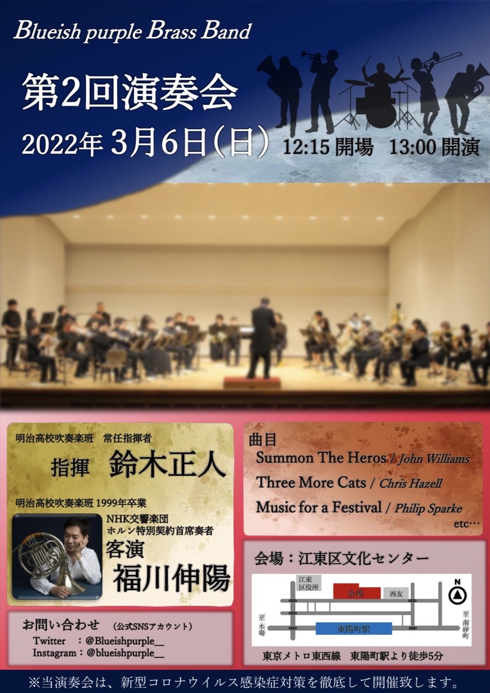 当団は、明治高校吹奏楽班の卒業生を中心に結成された金管バンドです。明治のスクールカラーである紫紺色(bluish purple)の青春を過ごした私たちが、コロナ禍でも音楽を続けていきたいという思いで手を取り合い、2021年2月に第1回演奏会を開催しました。回を重ねる毎にバックグラウンド豊かな団員が集い、精力的に活動を続けています。