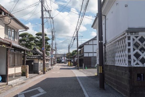 江⼾時代末期から、陸路では⽇向街道、⾈運でも要衝として発達した在町「⼾次本町」。大野川の氾濫から家屋を守る工夫が、この町の特徴的な街並みの景観をつくっています。