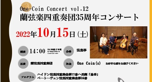 弦楽亭では、One-Coinで気軽に楽しめるコンサートシリーズを開催中です。今回は12回目、弦楽亭オーナー前嶋が所属する35周年を迎えるカルテットで、名曲、ハイドンの皇帝と、ベートーヴェンの最後の弦楽四重奏曲第16番をお届けします。円熟したアンサンブルをぜひお楽しみください。(by 弦楽亭オーナー 前嶋)