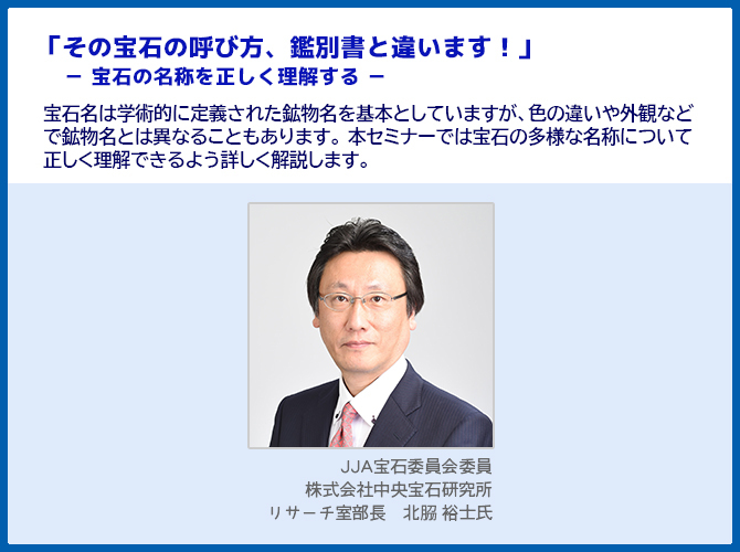 宝石名は鉱物名を基本としつつ、色や外観による別名や商業名が使われる場合があり、誤称に注意しながら正しい理解を促すセミナーです。