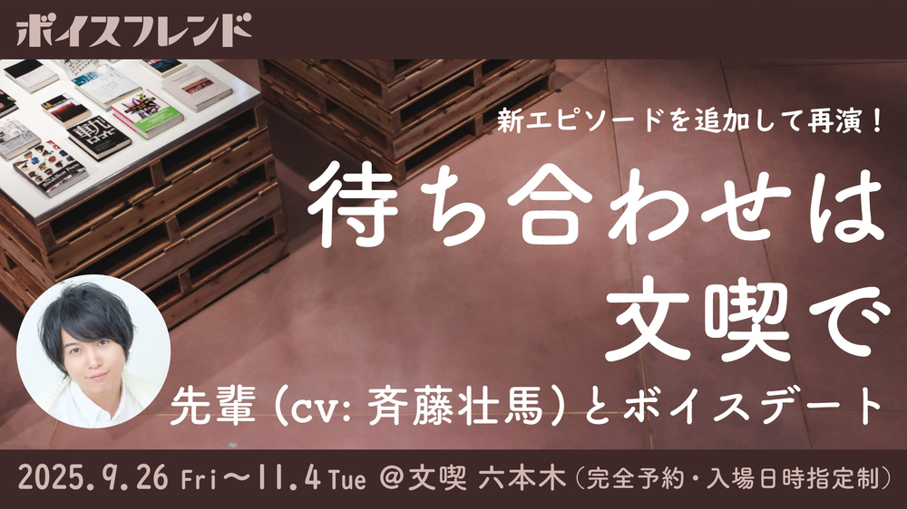 「待ち合わせは文喫で」は、読書家であり、執筆活動もされている声優・斉藤壮馬さんが演じる「先輩」と、大学の先輩後輩という設定で本にまつわる話や何気ない日常の話をしながら文喫店内をデートする、イマーシブ音声コンテンツです。