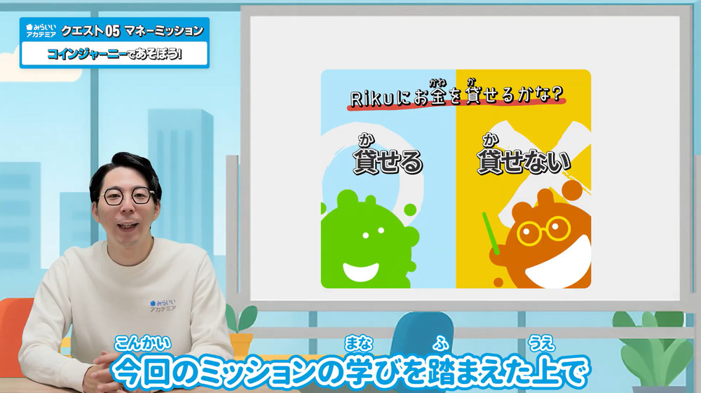 お子さま1人1台のタブレットで、冒険ゲーム「コインジャーニー」に挑戦!ゲームの中で遊ぶように夢中になりながら、お金にまつわる大切な考え方に自然と触れられる体験型コンテンツです。お金の知識や経験は不要なので、はじめてのお子さまでも安心!保護者の方はお子さまの様子を隣で見ながら「どんな判断をするかな?」と、ぜひ一緒にお楽しみください。