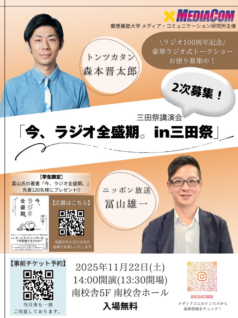 「今、ラジオ全盛期。」著者のニッポン放送冨山雄一さんをお招きし、ラジオ100周年を記念してラジオの魅力、可能性に迫ります。MCは元ハガキ職人のトンツカタン森本さんが務めます。