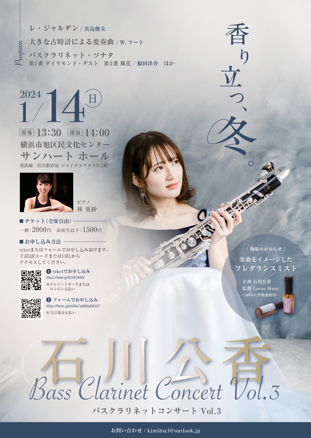 バスクラリネット奏者・石川公香による3度目のソロコンサート。バスクラリネットとピアノの多彩な音色で描く様々な「香り」、そして「冬」のすがたをぜひご堪能ください。