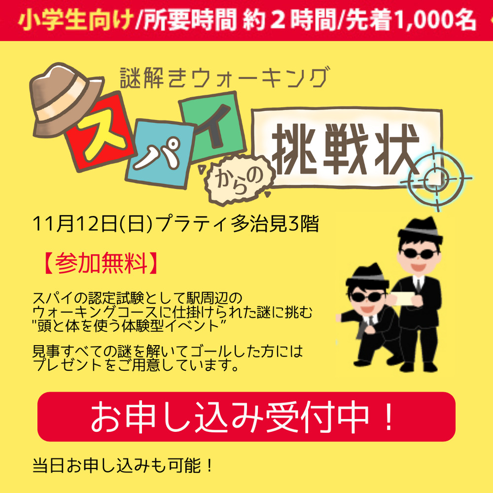 【参加無料】スパイの認定試験として駅周辺のウォーキングコースに仕掛けられた謎に挑む“頭と体を使う体験型イベント”。見事すべての謎を解きゴールした方にはお菓子などプレゼントをご用意しています。参加される人数分のチケットをお申込みください。