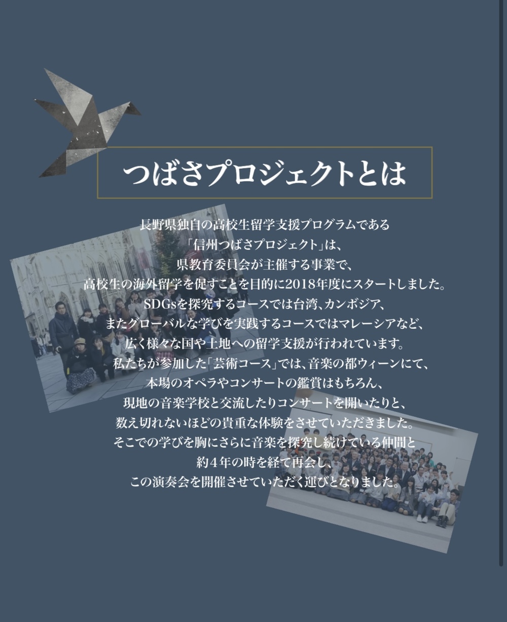 そこでの学びを胸にさらに音楽を探究し続けている仲間達と約4年の時を経て再会し、この演奏会を開催させていただく運びとなりました。器楽から声楽、更にクラシックからポピュラーミュージックまで、垣根を越えジャンルを超えた盛りだくさんなプログラムとなっております。