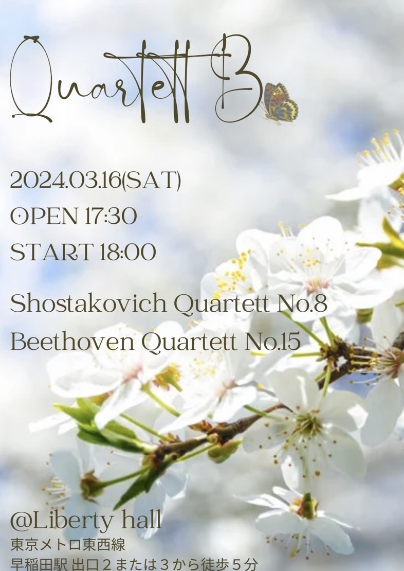 ベートーヴェン、バルトーク、ブラームスなどBの付く作曲家の弦楽四重奏曲を演奏するために集まったアマチュアの弦楽カルテットです。ベートーヴェンの第11番"セリオーソ"から始めて、ブラームスの第3番と共にいきなり、夢だったバルトークの第4番に挑戦した後、3回目の今回はベートーヴェンの後期に取り組むことにしました。ショスタコーヴィチの人気曲と共にお楽しみください。