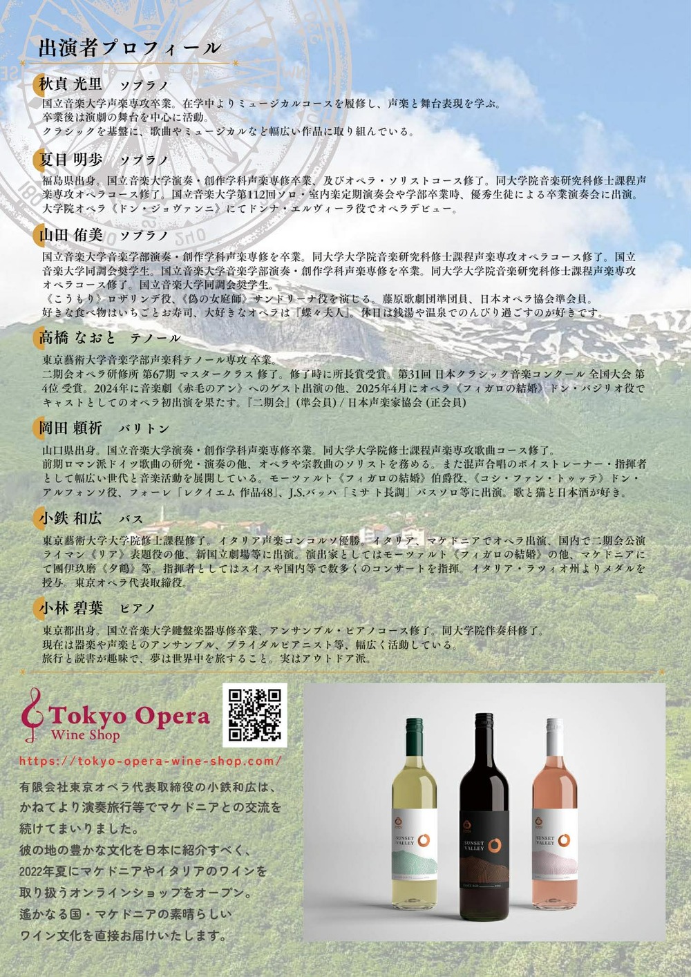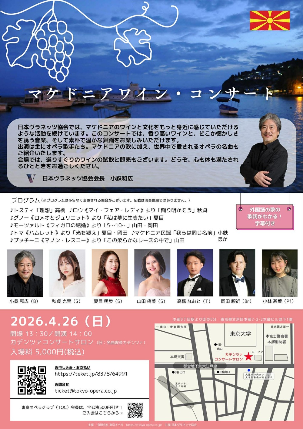 マケドニアワイン・コンサートは、マケドニアのワインや文化に触れ、同好の皆様と交流する、同協会の企画です。また、有限会社東京オペラによる、マケドニアワイン即売会も開催されます。