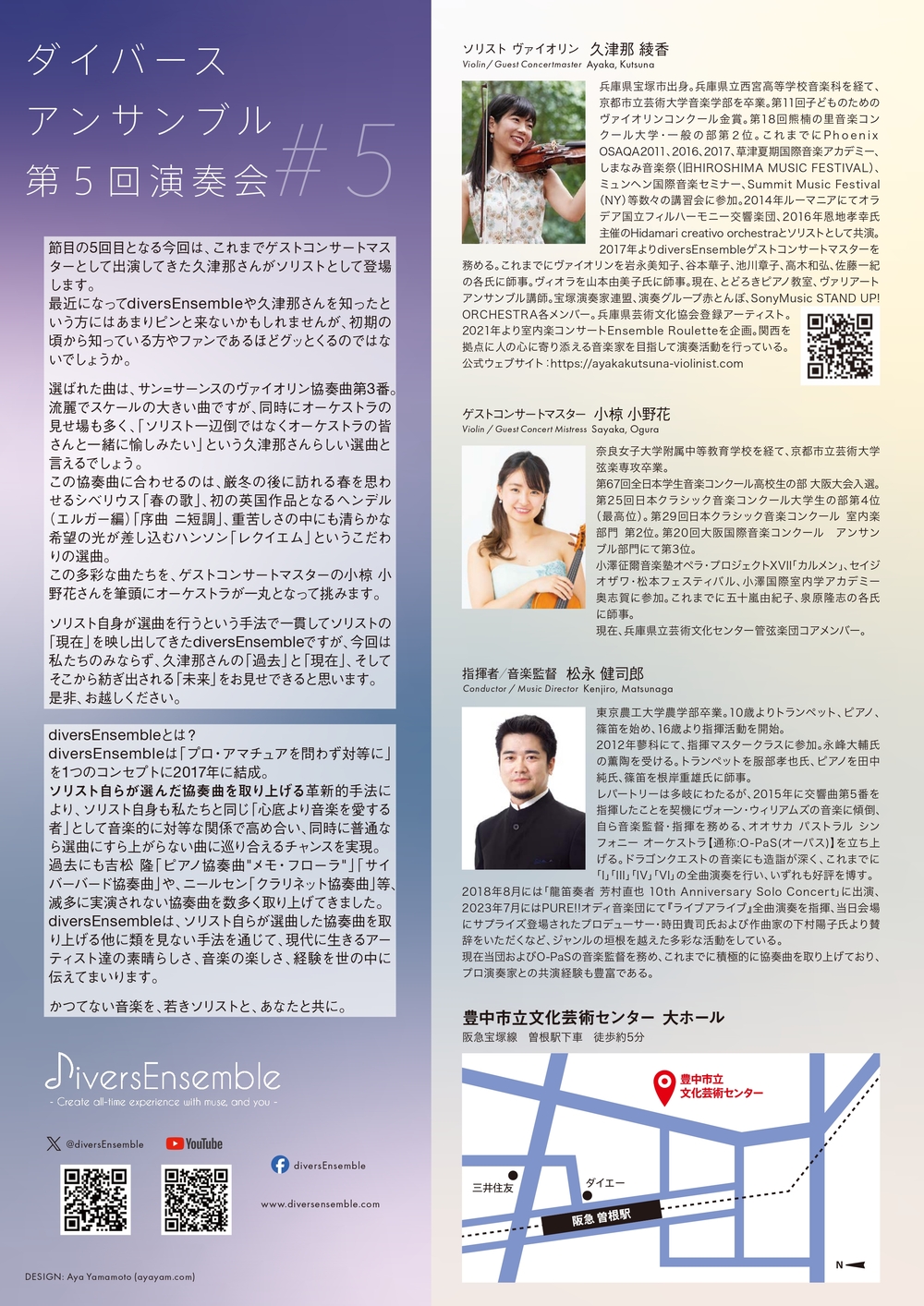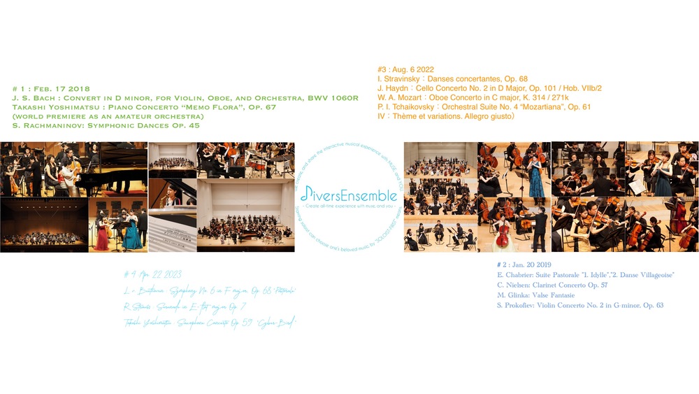 diversEnsembleは「diverse(多様な)」+「ensemble(アンサンブル)」の造語であり、主に関西で活動する様々な立場の演奏家が集まり2017年に結成。「プロ・アマチュアを問わず対等に」というコンセプトを掲げ、同じ“アーティスト”として音楽的に対等な関係で刺激を与え合い、高め合う事を意図しています。