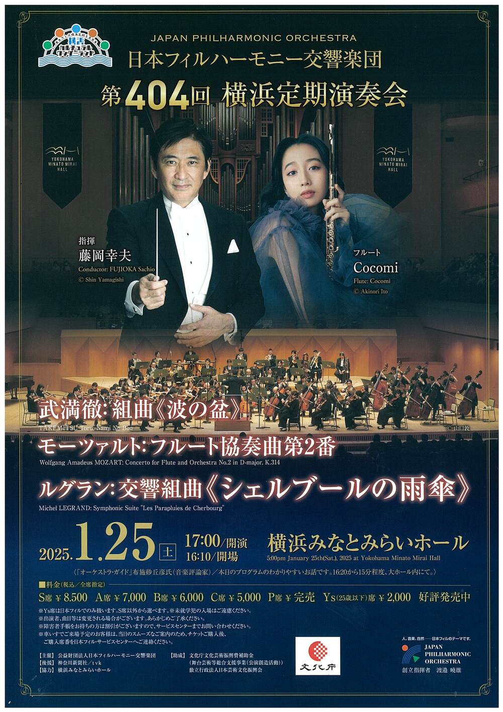武満徹がテレビドラマのために書いた気が遠くなるほどの美しさを放つ《波の盆》と、今話題のフルーティストCocomiを迎えたモーツァルトのコンチェルト。そして最後は誰もが耳にしたことある「あのメロディ」が圧倒的なミシェル・ルグランの《シェルブールの雨傘》の音楽をお贈りします。Cocomiの伸びやかな笛の音に聴き手は魅了されずにはいられませんし、《波の盆》《シェルブール》の可憐さ、切なさには必ずや心揺さぶられることでしょう。特に後者は「交響組曲」の名に相応しい30分近くを要する大作です。ジャズやミュージカルの要素も取り入れた非常に聴きやすく誰もが楽しめる音楽です。