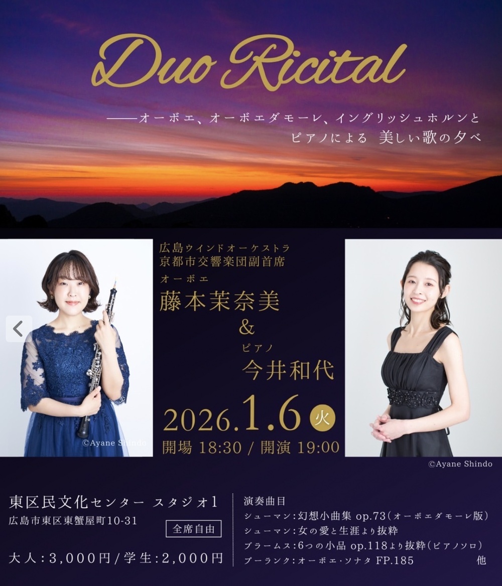 広島市出身のピアニスト今井和代と、山口県岩国市出身で広島ウインドオーケストラオーボエ奏者の藤本茉奈美。