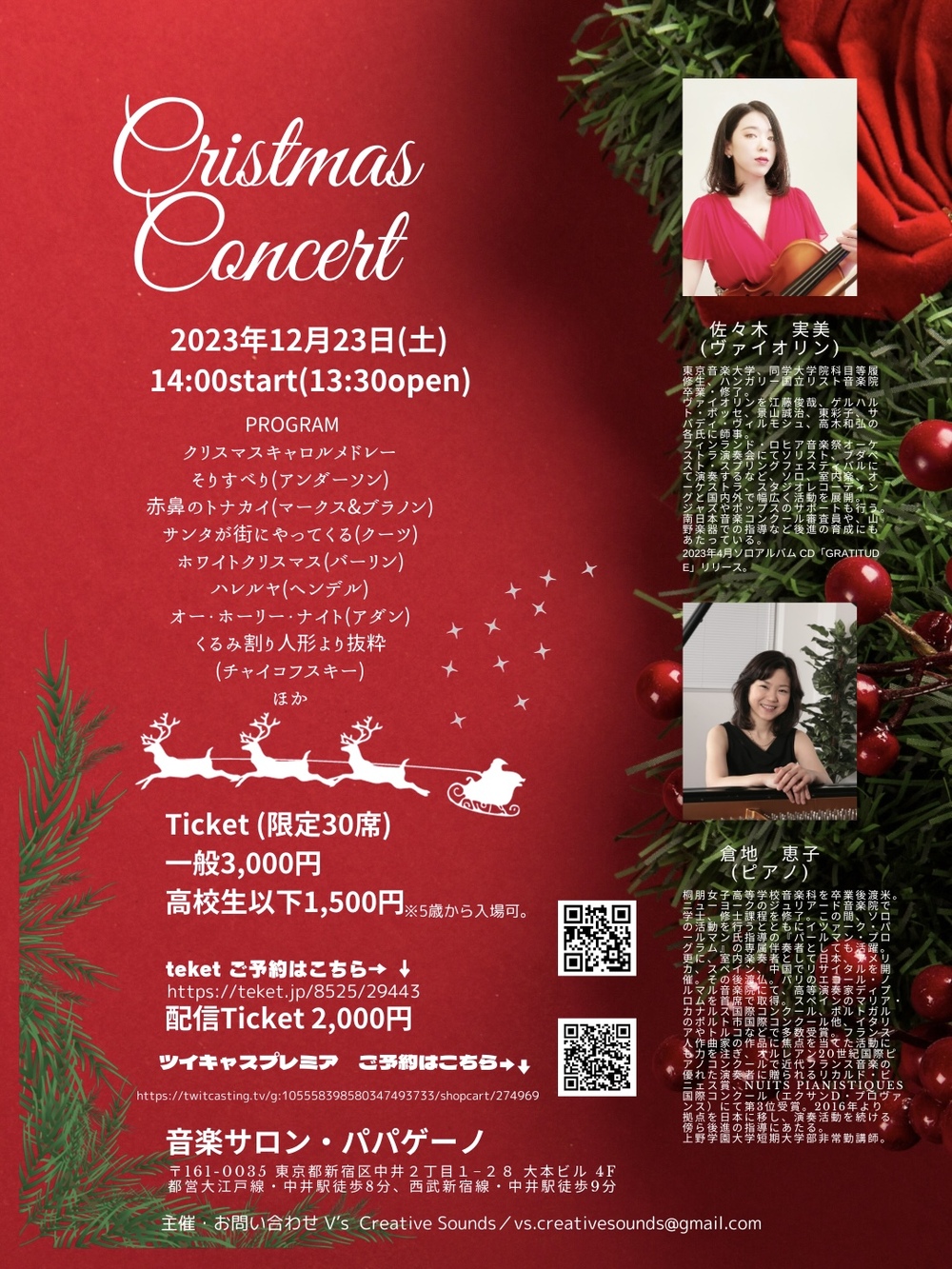 ヴァイオリニスト佐々木実美がお送りする、みんなが大好きなクリスマスの音楽を詰め込んだ一足早いクリスマス。楽しいひとときをご一緒に。