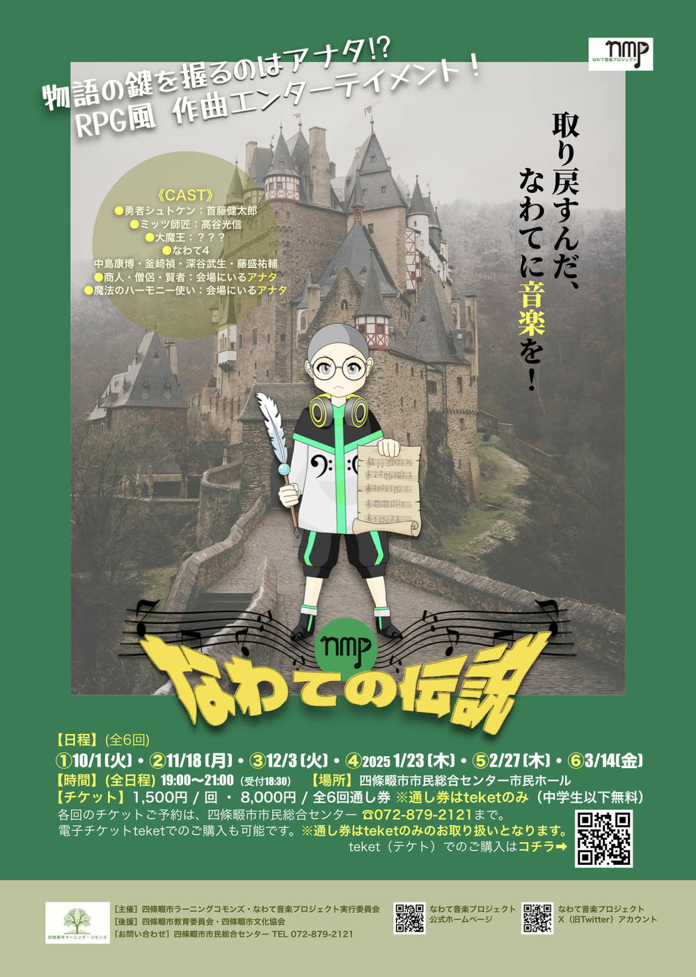 『なわての伝説』は、クラシック音楽や作曲法に馴染みがない人でも楽しむことができる、ライブコンポジション(その場で生作曲)型のRPG風エンターテイメント!各回のイベントに、お客様自身が登場キャラクターとして参加することで、作曲についてワクワクしながら学ぶことができます♪