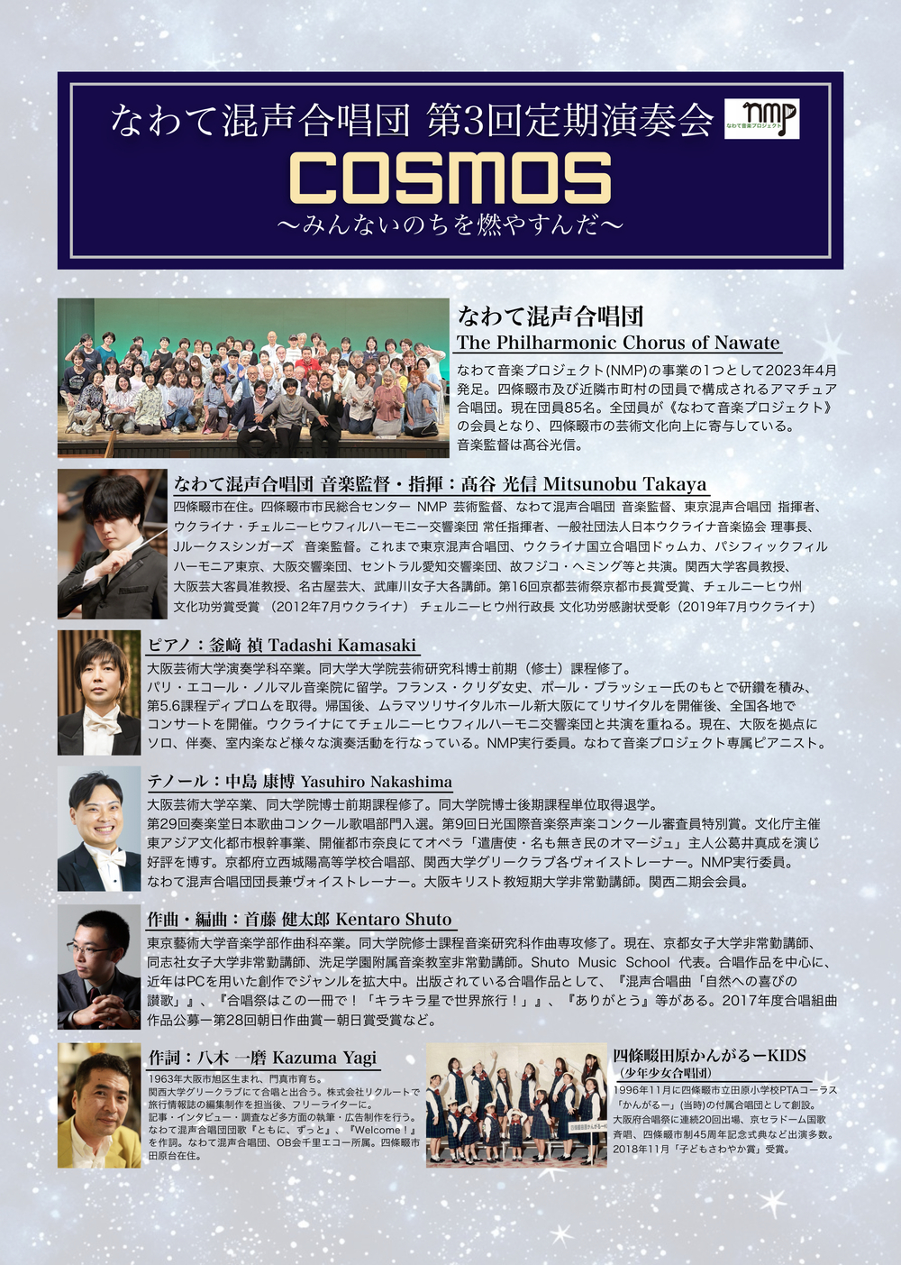 ゲストに四條畷田原かんがるーKIDS(少年少女合唱団)の皆さんをお迎えし、COSMOSを会場のお客様と共に歌います!