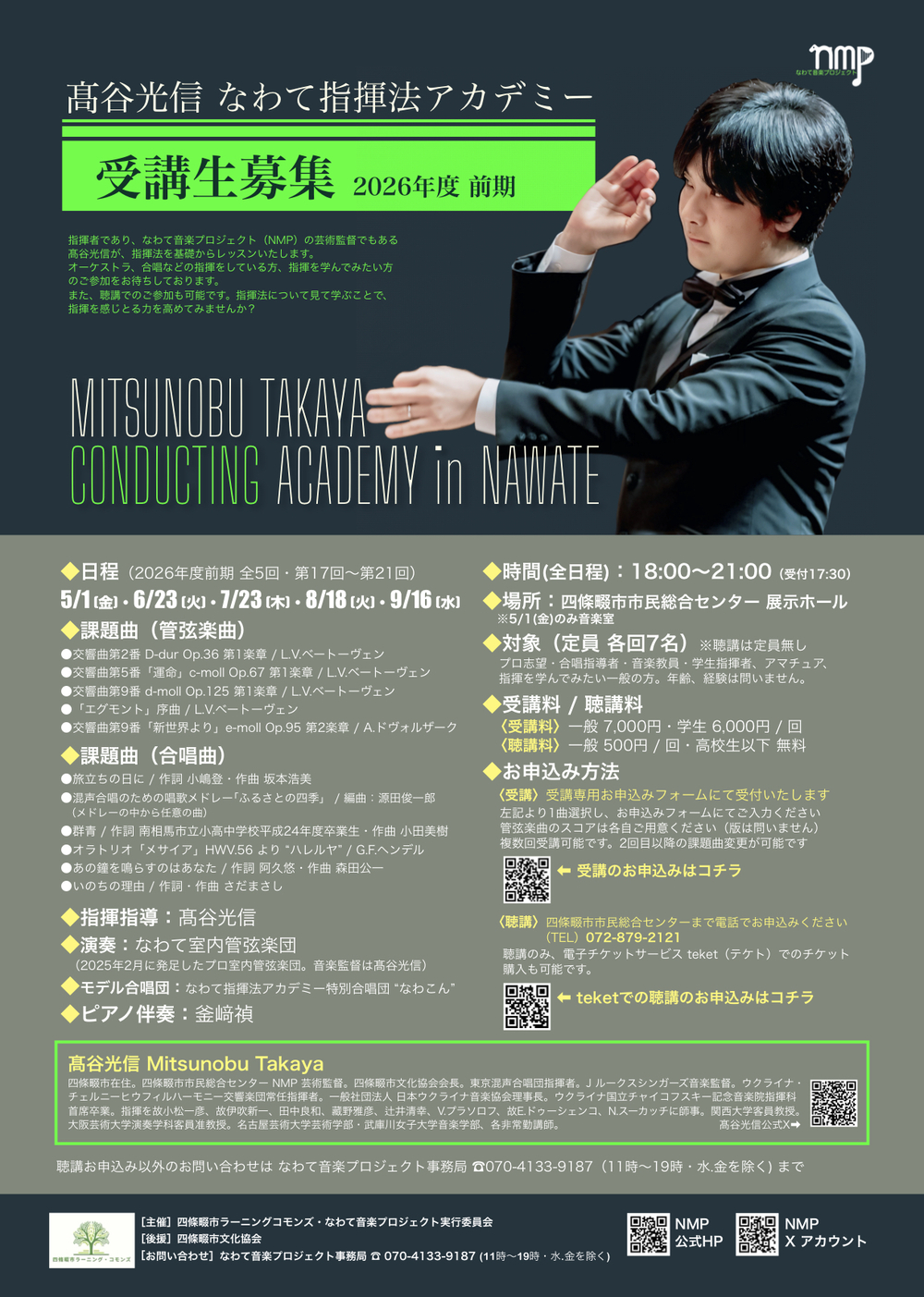 指揮者であり、なわて音楽プロジェクト(NMP)の芸術監督でもある高谷光信が、指揮法を基礎からレッスンいたします。