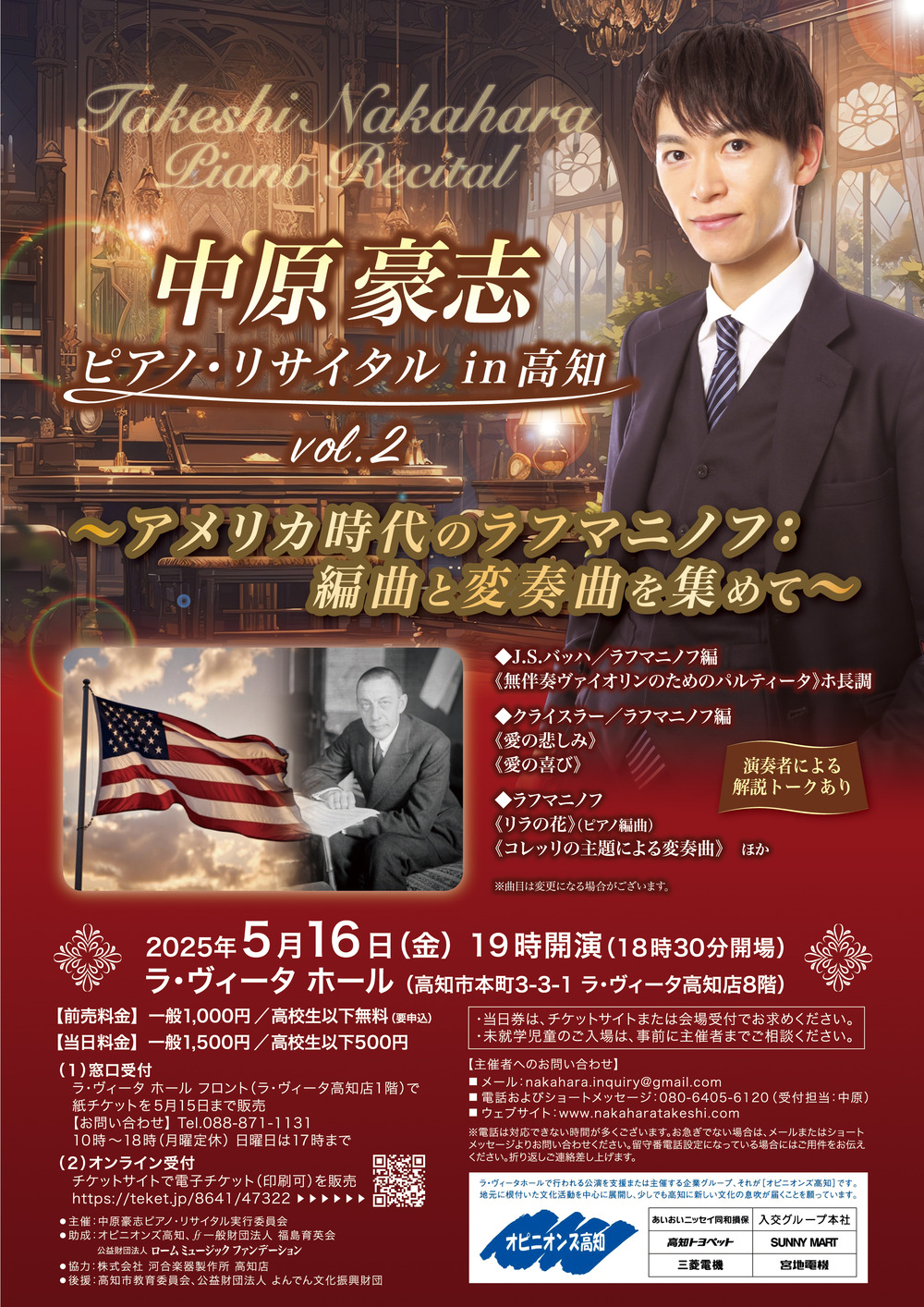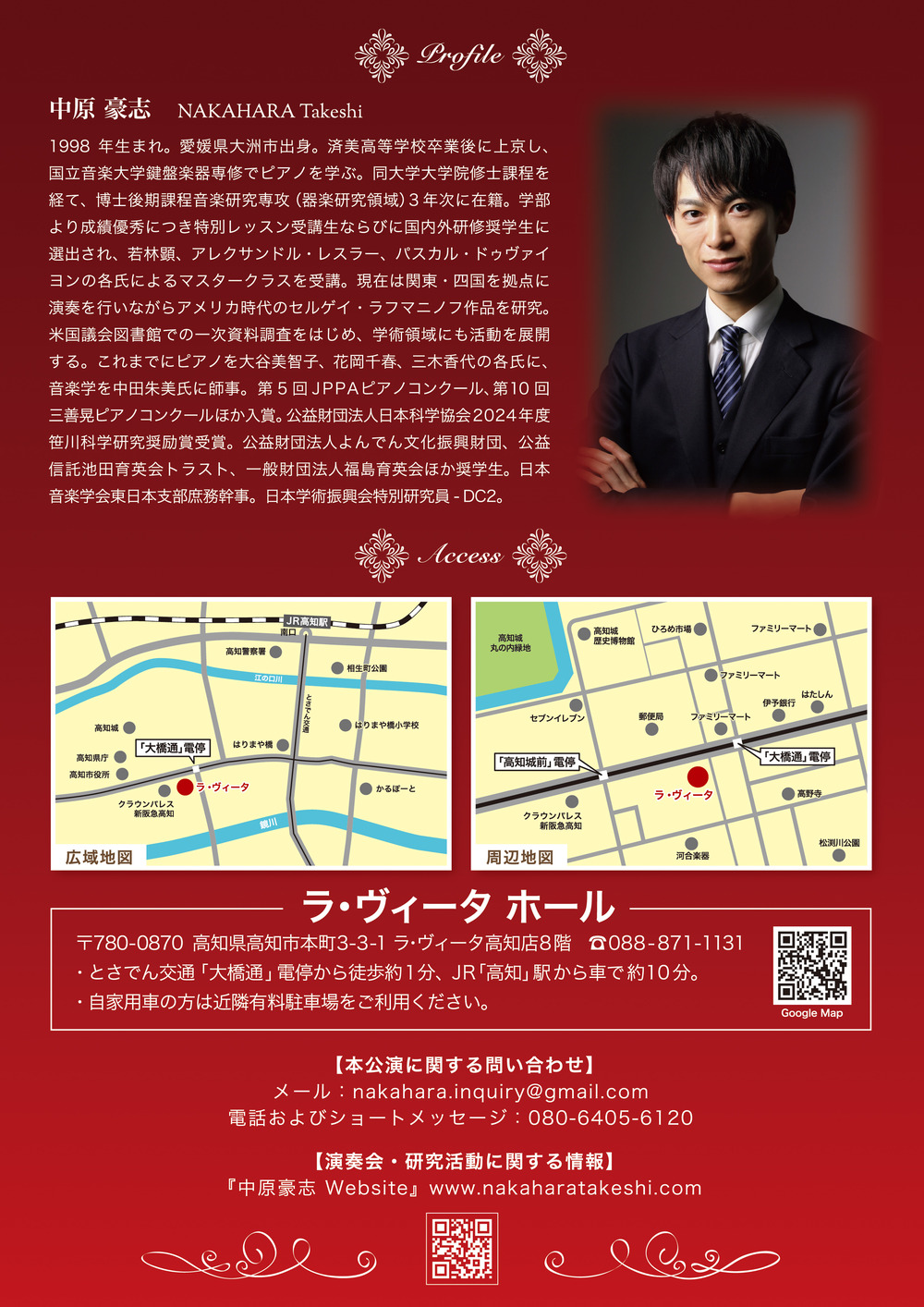 セルゲイ・ラフマニノフ(1873-1943)のピアノ編曲作品と変奏曲を取り上げます。演奏者による解説トークもあります。