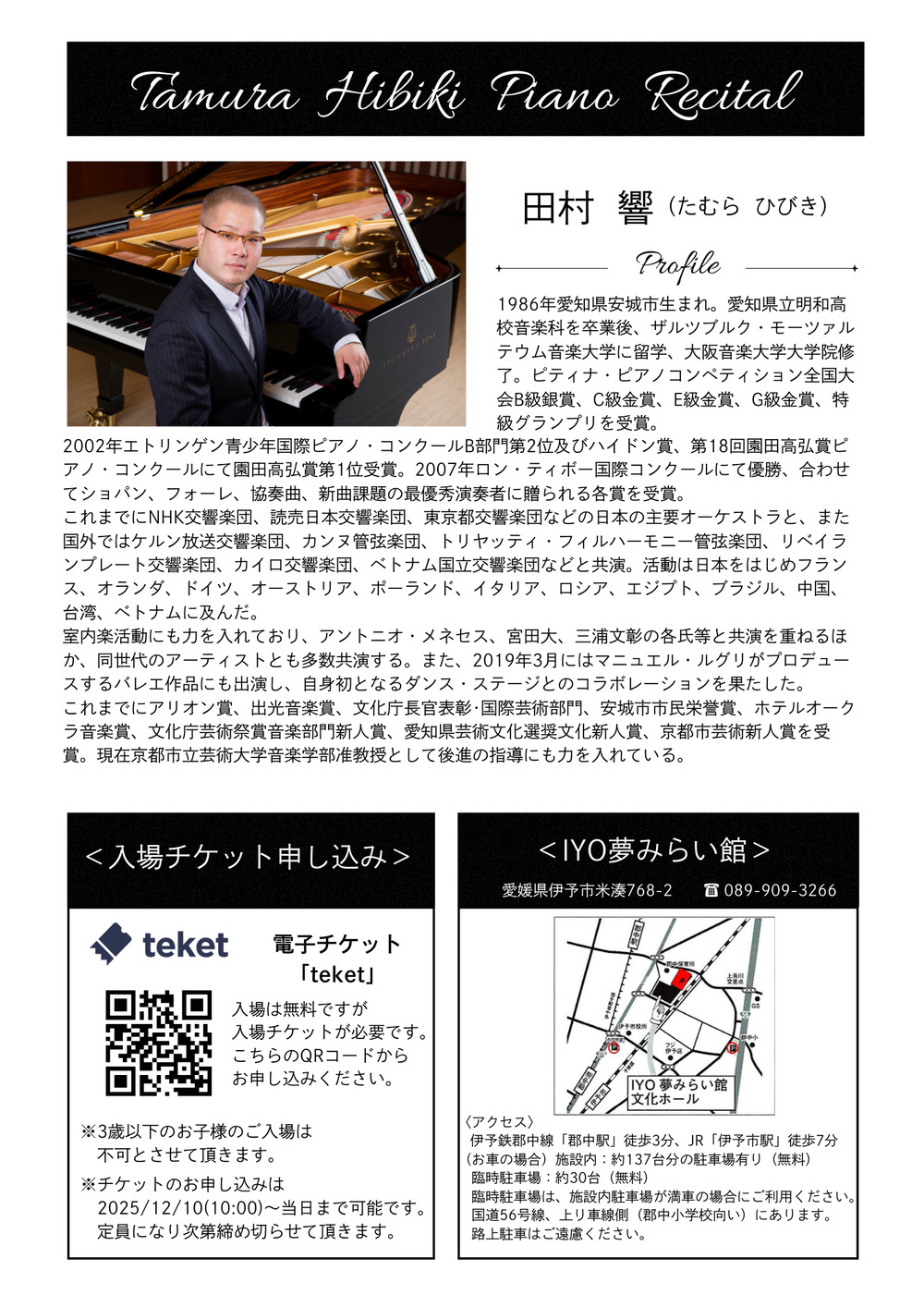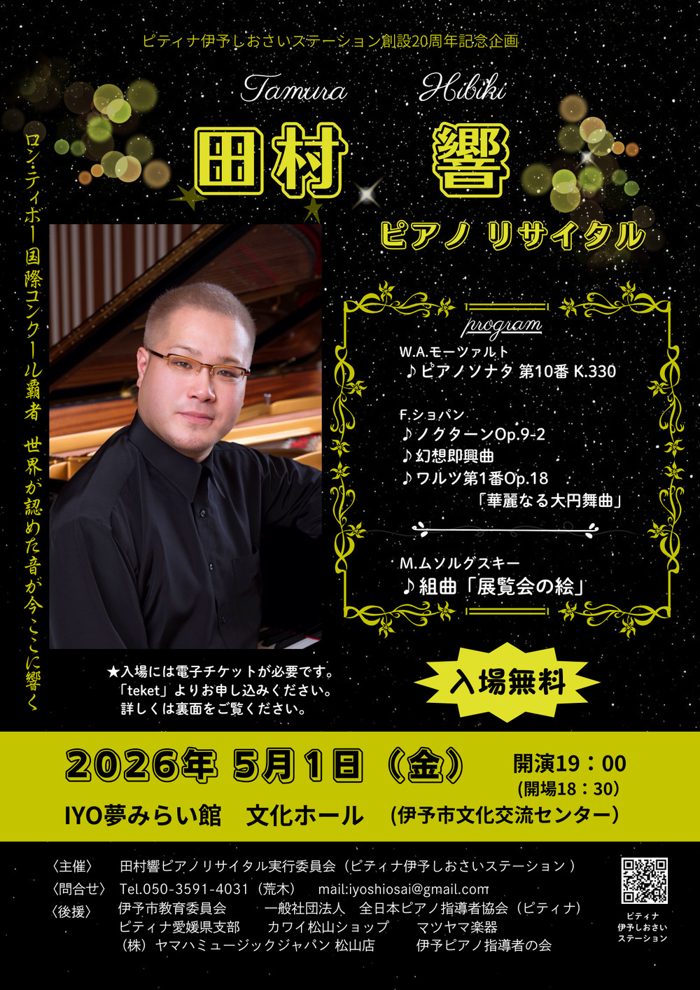 ピティナ伊予しおさいステーション創設20周年を記念して、ピアニスト田村響先生のリサイタルを開催します。