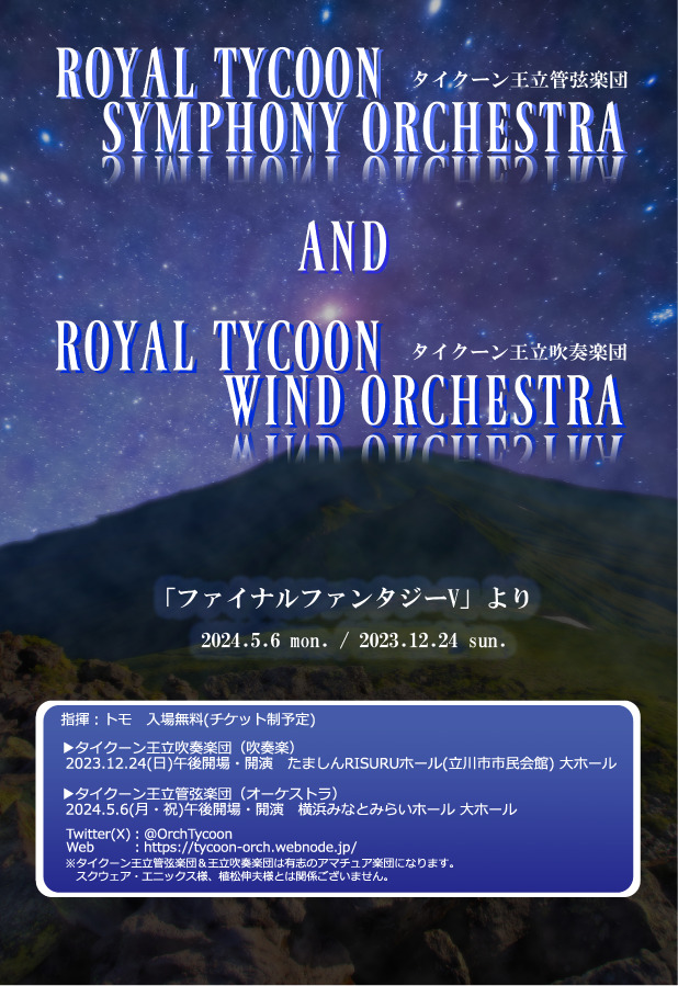 タイクーン王立吹奏楽団では、ファイナルファンタジー5の楽曲をあますことなく吹奏楽にてお届けいたします。