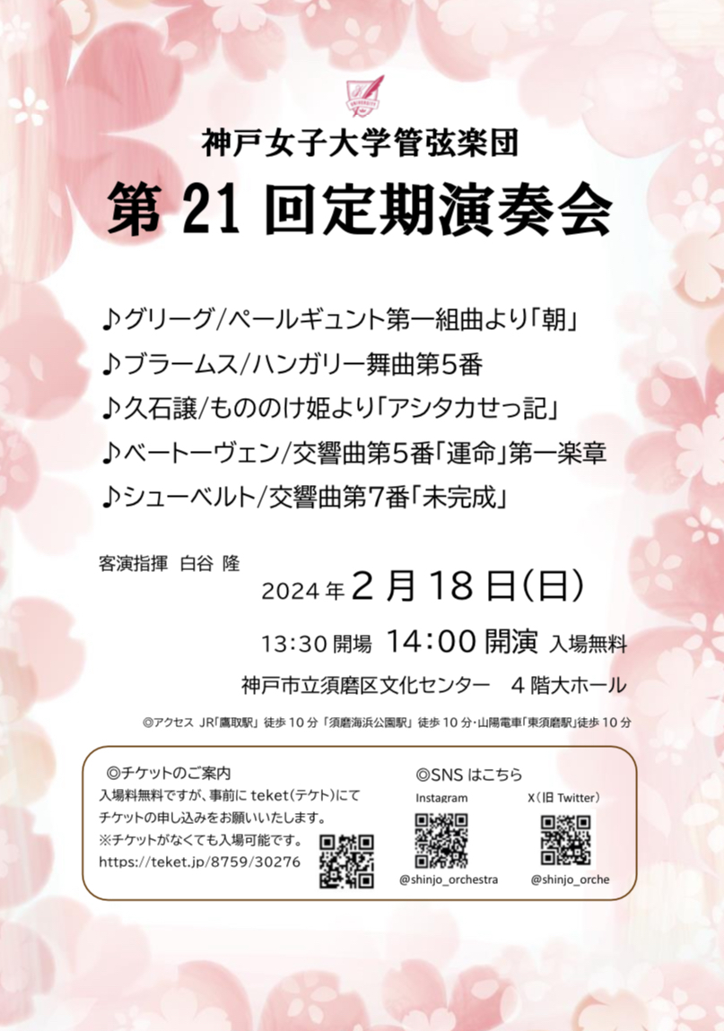 神戸女子大学管弦楽団は2000年、5名の意思によって「オーケストラ同好会」として発足しました。2001年から積極的に学校行事に参加、2003年には同好会から部に昇格し、「神戸女子大学管弦楽団」に改名するとともに、同年11月、発足から4年目にしてついに第一回記念定期演奏会を開催し、2023年には20回という節目を迎えました。 現在、団員10名の神女オケですが、なんといってもアットホームな部の雰囲気が自慢です。団員全員が演奏、部の運営に主体となって関わり、年に一度の演奏会を作り上げています。また、大学から楽器を手にした部員も多い中、未熟ながらも日々練習に励んでいます。 今回で21回目を迎える定期演奏会ですが、これからも神女サウンドを追及し続け、さらなる発展にむけて団員一同全力で取り組んでまいります。