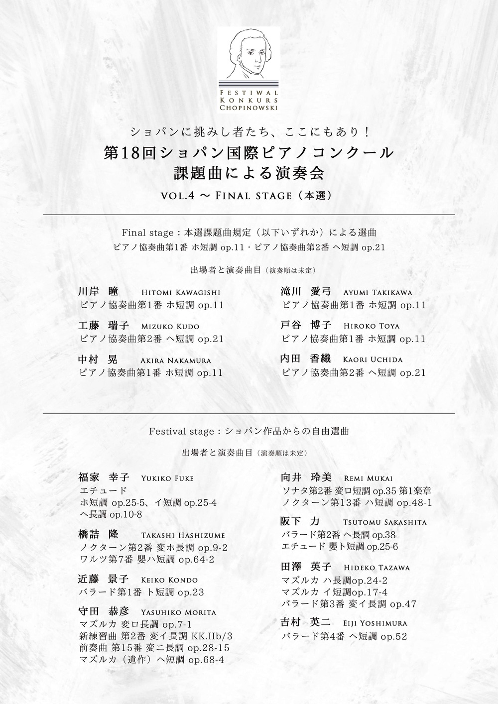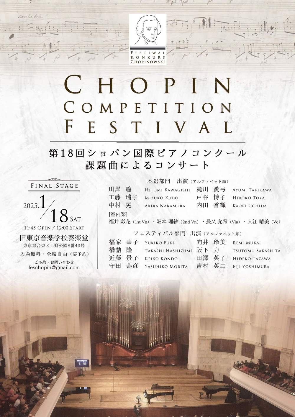 ショパンに魅せられた社会人アマチュアピアニストたちが企画した「第18回ショパン国際ピアノコンクール課題曲によるコンサート」、ついにファイナルステージとなりました。