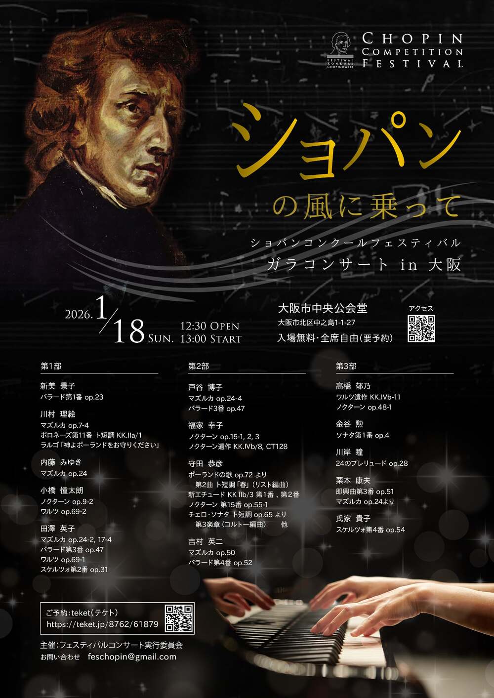私たちはショパンを愛するアマチュアピアニスト集団です。ショパン国際ピアノコンクールの課題曲を連続演奏するコンサートを「ショパコンフェス」として開催してまいりましたが、このたび、関西のアマチュアピアニスト仲間も加わり、オールショパンのコンサートを開催することになりました。会場は大阪市中央公会堂。歴史的建造物の見学がてら私たちのコンサートにご来場賜れば幸いです。