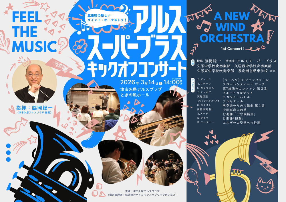 津市久居アルスプラザの開館5周年を記念して結成したウインド・オーケストラ、「アルススーパーブラス」の第1回定期演奏会です。特別ゲストとして、久居中学校・久居西中学校・久居東中学校の合同吹奏楽部メンバー、第47回全日本おかあさんコーラス全国大会でグランプリに輝いた香良洲自動車学校を迎えて開催します。
