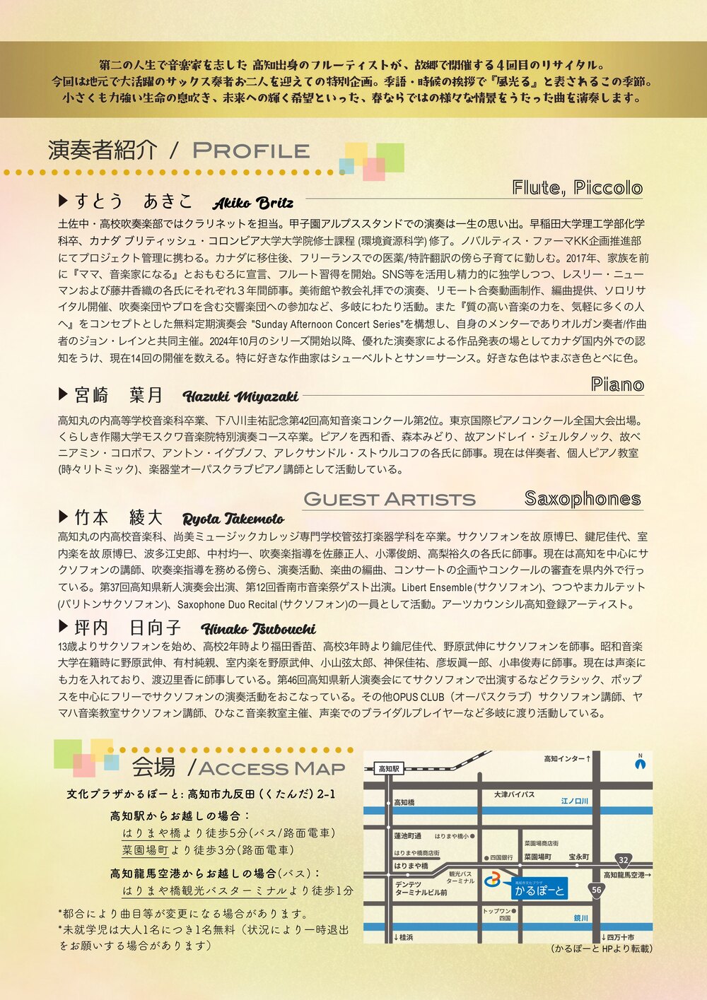 「ママ、音楽家になるー」四十路で突如音楽家を志した高知市出身カナダ在住のフルーティストの、地元開催4度目のリサイタル。今回は、高知で活躍するサックス奏者お二人をゲストに迎えての特別企画です。季語や時候のあいさつで『風光る』と美しく表されるこの季節✨🕊🌸🌱 小さくも力強い生命の息吹き、未来への輝く希望、恋の予感といった、春ならではの様々な情景をうたった人気の曲、そして隠れた名曲の数々を演奏します。お席は十分の数あり、ゆったりとお座りいただけます。お誘い合わせの上ぜひお気軽にお越しください。金属でできた木管楽器三本とピアノによる、特別なアンサンブルの音色もお楽しみに!