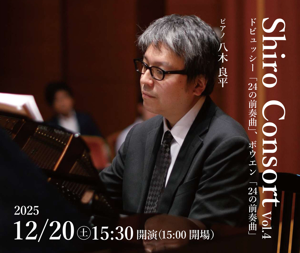 2024年2月にウクライナのピアノ曲、2025年2月にツィンツァーゼ 24の前奏曲を演奏した八木良平が、今回はドビュッシー「24の前奏曲」、ボウエン「24の前奏曲」を演奏します。