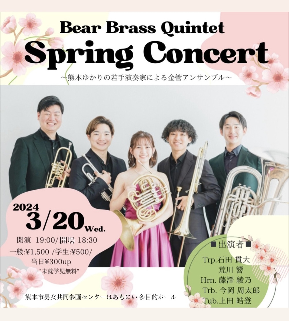 2023年に熊本にゆかりのある若手演奏家(平均年齢22.5歳!)で結成した金管5重奏団です。記念すべき最初のスプリングコンサートでは、コンサートはじめましての方、アンサンブルを頑張っている学生の皆さん、音楽好きの大人の皆様に楽しんでいただけるようなプログラムをご用意してお待ちしております♪