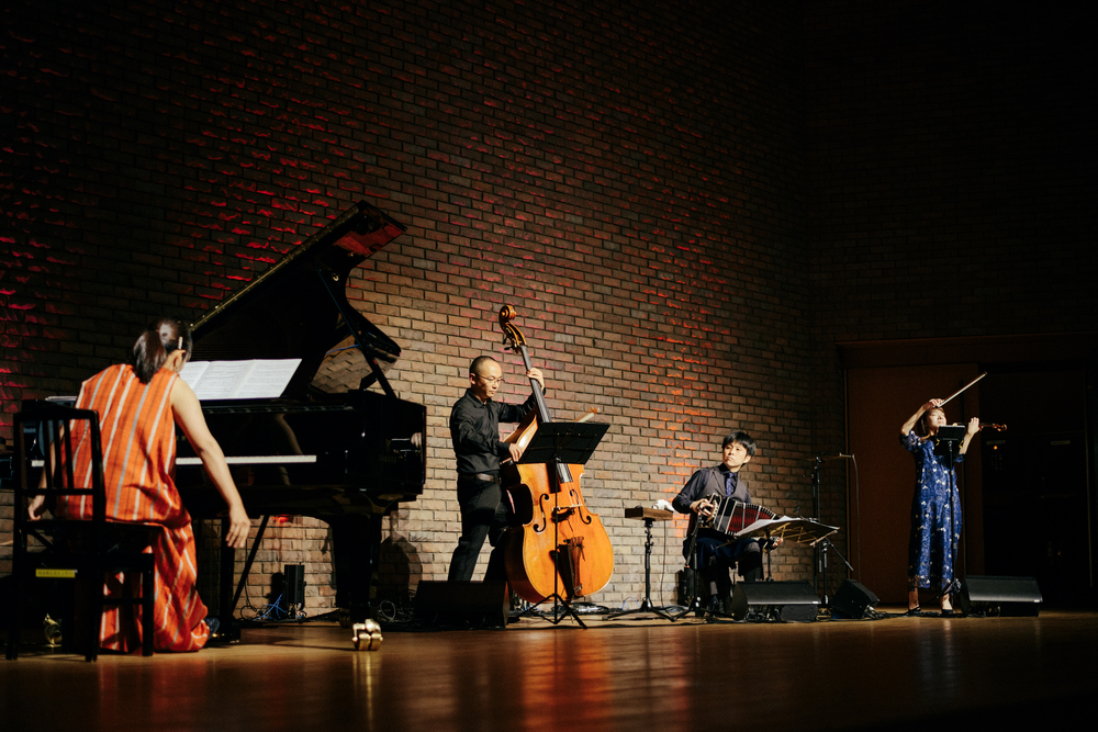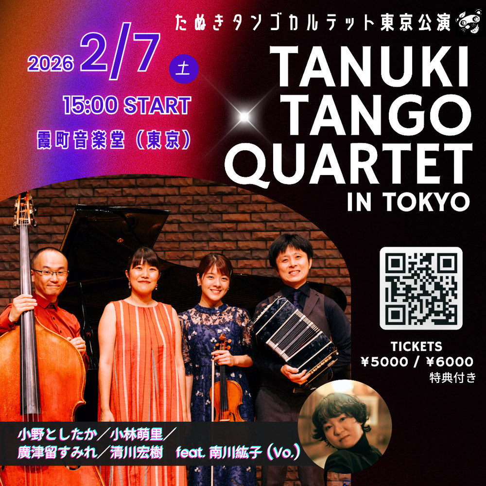 たぬきタンゴカルテットとは:全国各地の若手のたぬき、いや、若手タンゴ奏者で結成された四重奏団であり、 茨城県笠間市に住むニホンタヌキの夫婦をモチーフにしたピアニスト小林萌里の楽曲 「たぬきのミロンガ」にちなんで命名されました。 世界のどこを探してもいない、日本だけに生息するニホンタヌキのように、 この楽団でしか聴くことのできない音楽を届けたい。 自国の文化を大切にしながらタンゴを発展させていきたい——そんな思いを込めています。