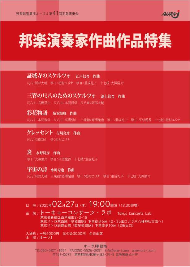 尺八Ⅰ:本間豊堂 尺八Ⅱ:高橋慧山 三味線:野澤徹也 箏Ⅰ:重成礼子 箏Ⅱ:平原愛香 十七絃:松村エリナ