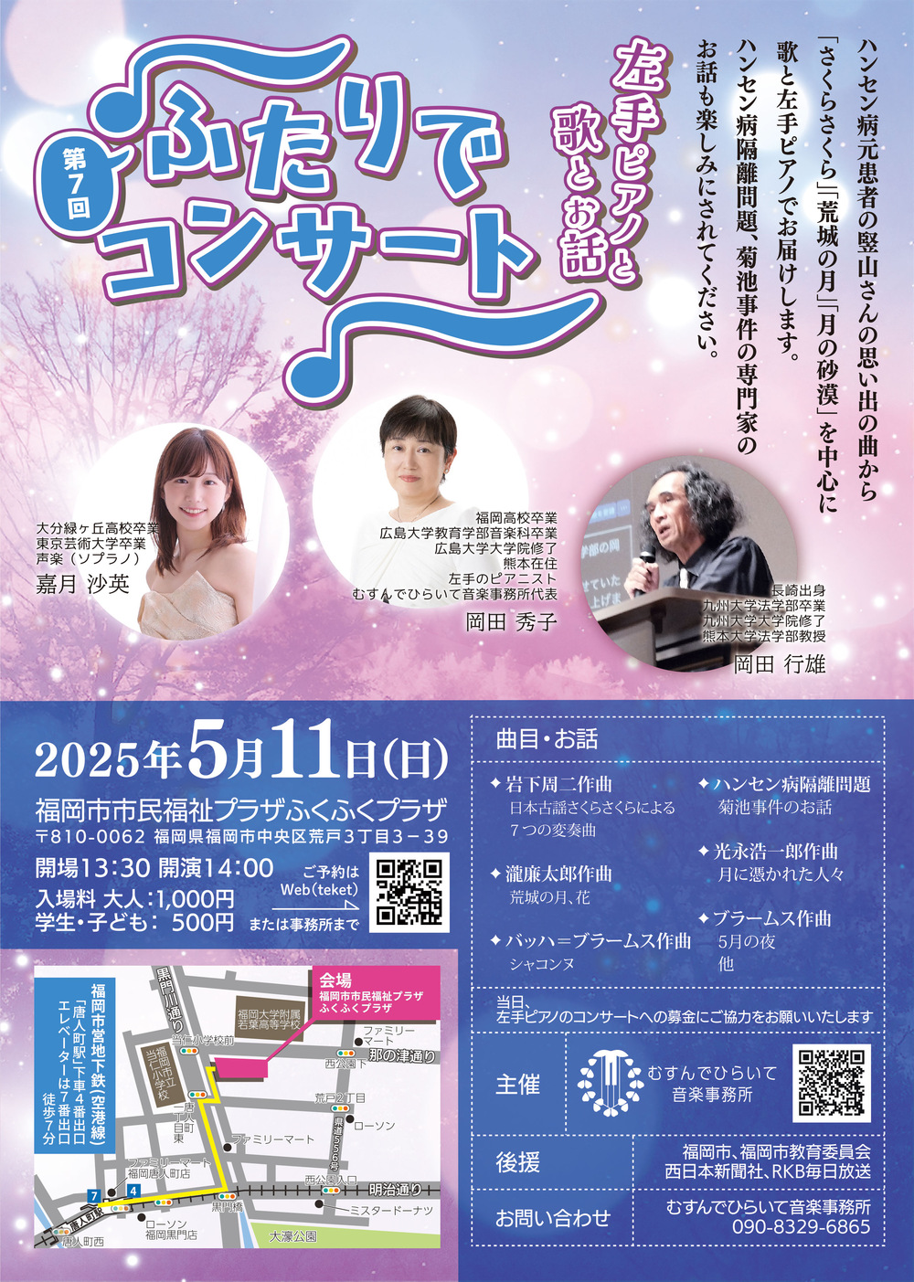 ハンセン病元患者の竪山さんの思い出の曲から「さくらさくら」「荒城の月」「月の砂漠」を中心に歌と左手ピアノでお届けします。ハンセン病隔離問題、菊池事件の専門家のお話も楽しみにされてください。
