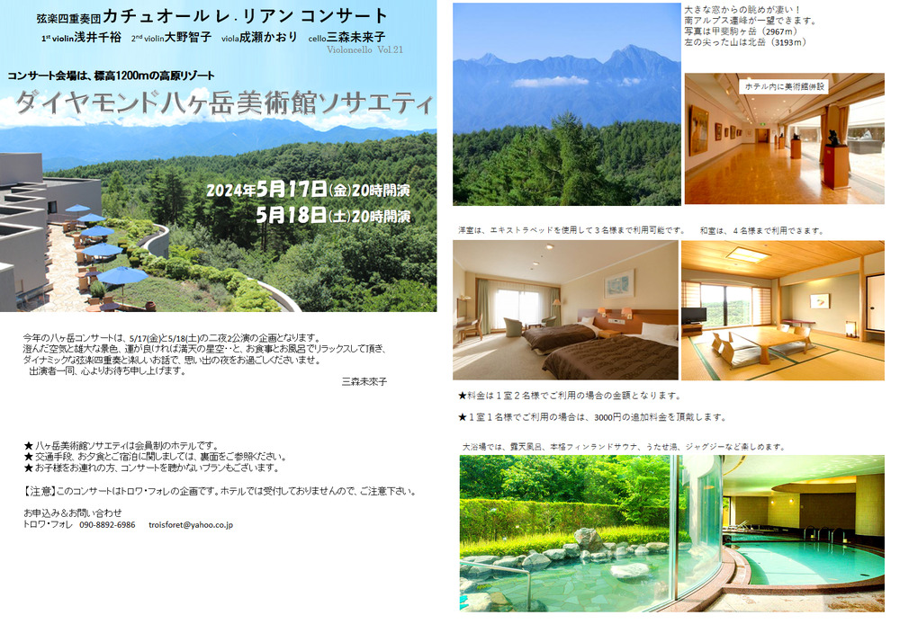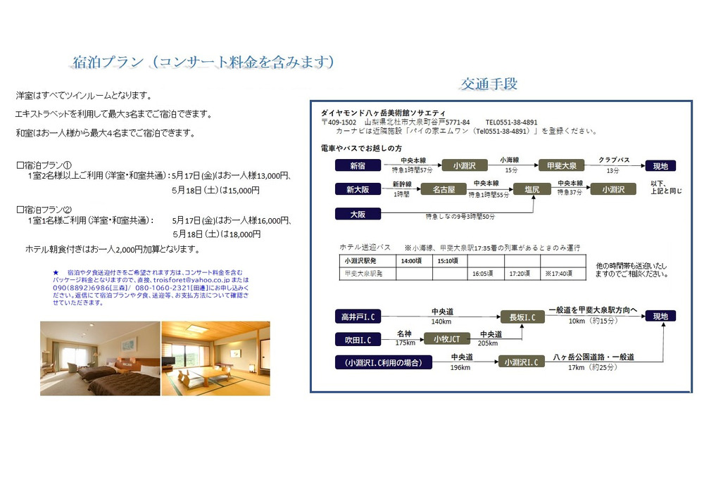 その他のお問い合わせ先:トロワ・フォレ お電話:080(1060)2321 メール:troisforet@yahoo.co.jp 公演は2回ございます。5月17日(金)・18日(土)のいずれのお日にちか、ご回答ください。また、ご宿泊される方は、掲載写真を参考に、1.宿泊プラン(客室数、ご希望のお部屋:洋室または和室、宿泊人数とお名前、朝食のご希望の有無)、2.夕食プラン(①ホテル室内お弁当 ・ ②外食送迎プラン[掲載した6か所のお店から1箇所をお選びください] ・ ③希望しない)、電車でお越しの場合は、小淵沢駅到着時刻と送迎の希望の有無についてお知らせください。