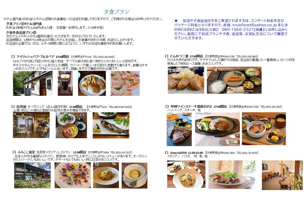 ★宿泊や夕食送迎付きをご希望されます方は、コンサート料金を含むパッケージ料金となりますので、直接、troisforet@yahoo.co.jpまたは090(8892)6986[三森]/ 080-1060-2321[田邉]にお申し込みください。返信にて宿泊プランや夕食、送迎等、お支払方法について確認させていただきます。