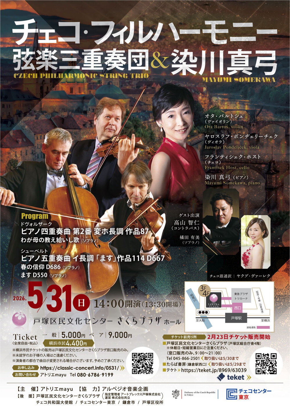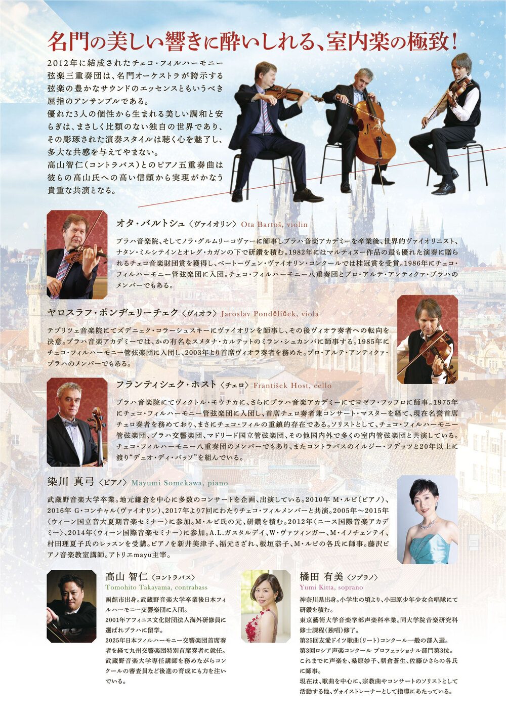 2012年に結成されたチェコ・フィルハーモニー弦楽三重奏団は、名門オーケストラが誇示する弦楽の豊かなサウンドのエッセンスとも言うべき屈指のアンサンブルである。優れた3人の個性から生まれる美しい調和と安らぎは、まさしく比類のない独自の世界であり、その彫琢された演奏スタイルは聴く心を魅了し、多大な共感を与えてやまない。4回目の共演となる染川真弓とは毎回好評を博している。メインプログラムとなる高山智仁(コントラバス奏者)とのピアノ五重奏曲は彼らの高山氏への高い信頼から実現がかなう貴重な共演となる。