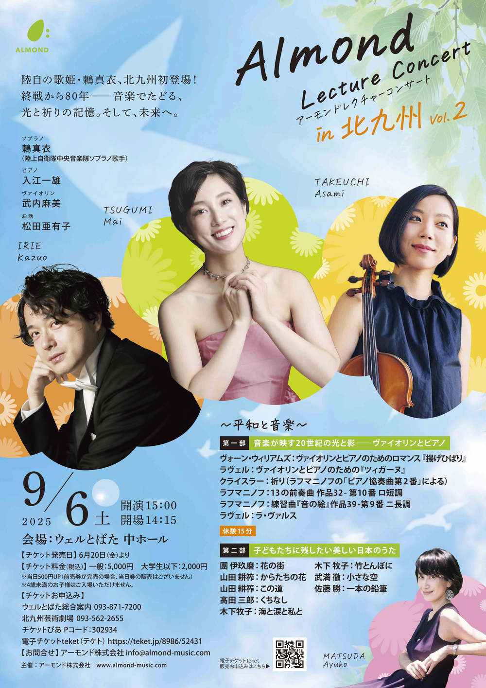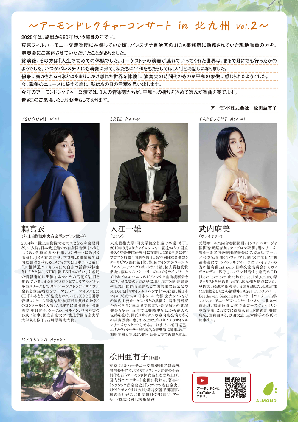 今年のアーモンドレクチャー公演では、3人の音楽家たちが、平和への祈りを込めて選んだ楽曲を奏でます。