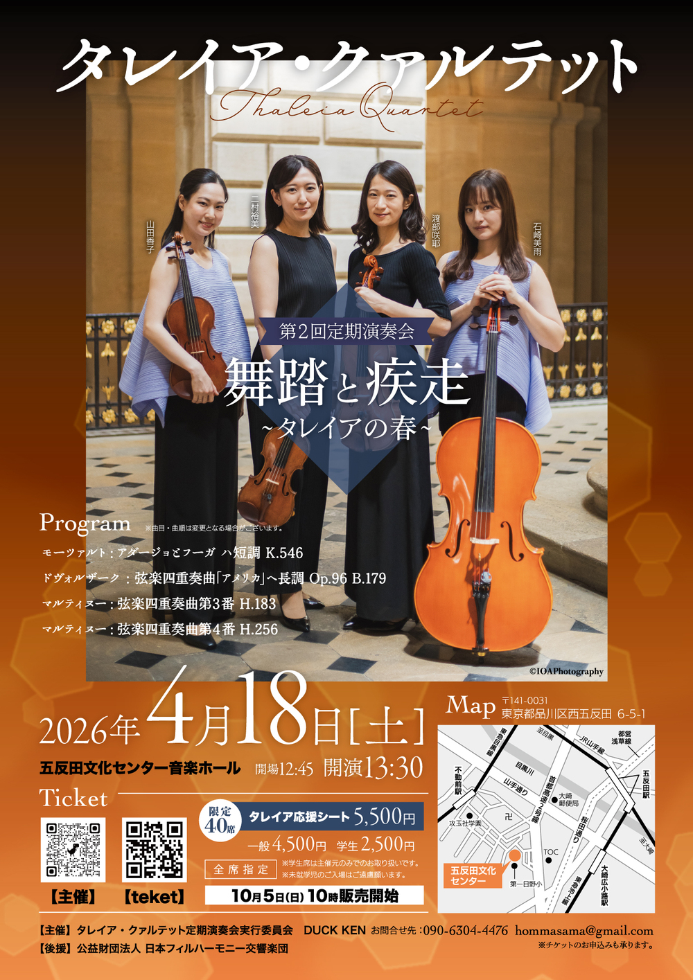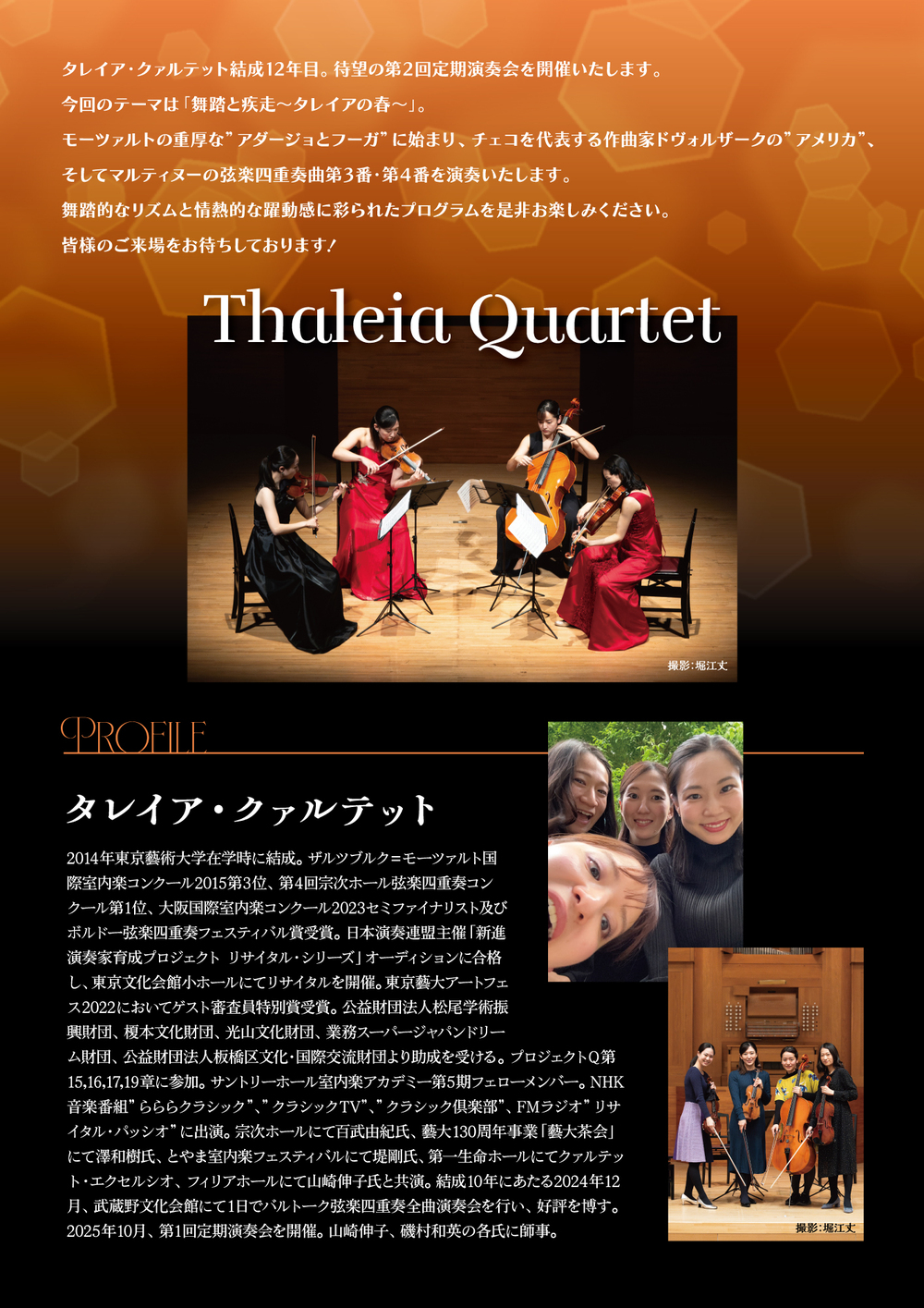 タレイア・クァルテット結成12年目。待望の第2回定期演奏会を開催いたします。今回のテーマは「舞踏と疾走~タレイアの春~」。