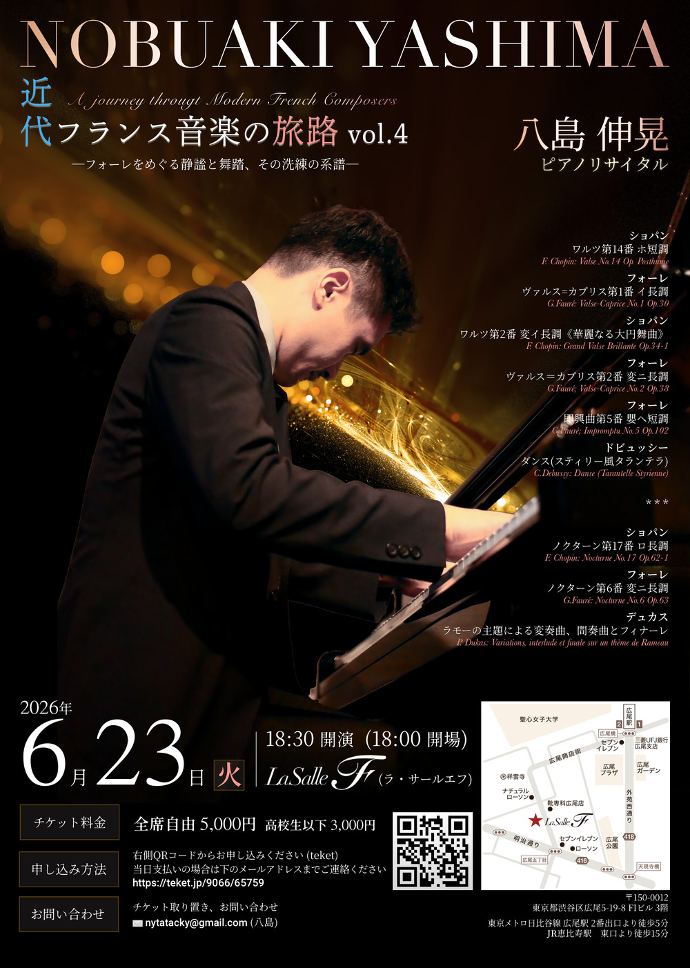 本公演では前半に舞曲、後半に夜想曲を配し、それぞれの形式を通してフォーレの美質を浮かび上がらせます。舞踏のリズムが次第に洗練へと昇華され、やがて夜の静謐の中で内面的な光へと変わってゆく──その移ろいを、一つの物語として辿ります。